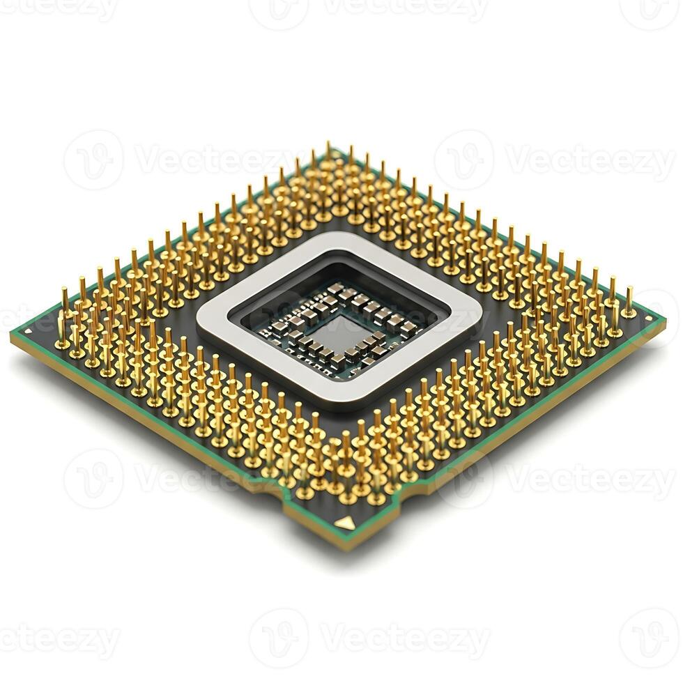 A computer processor chip with many gold pins arranged around its square central unit Pro Photo
