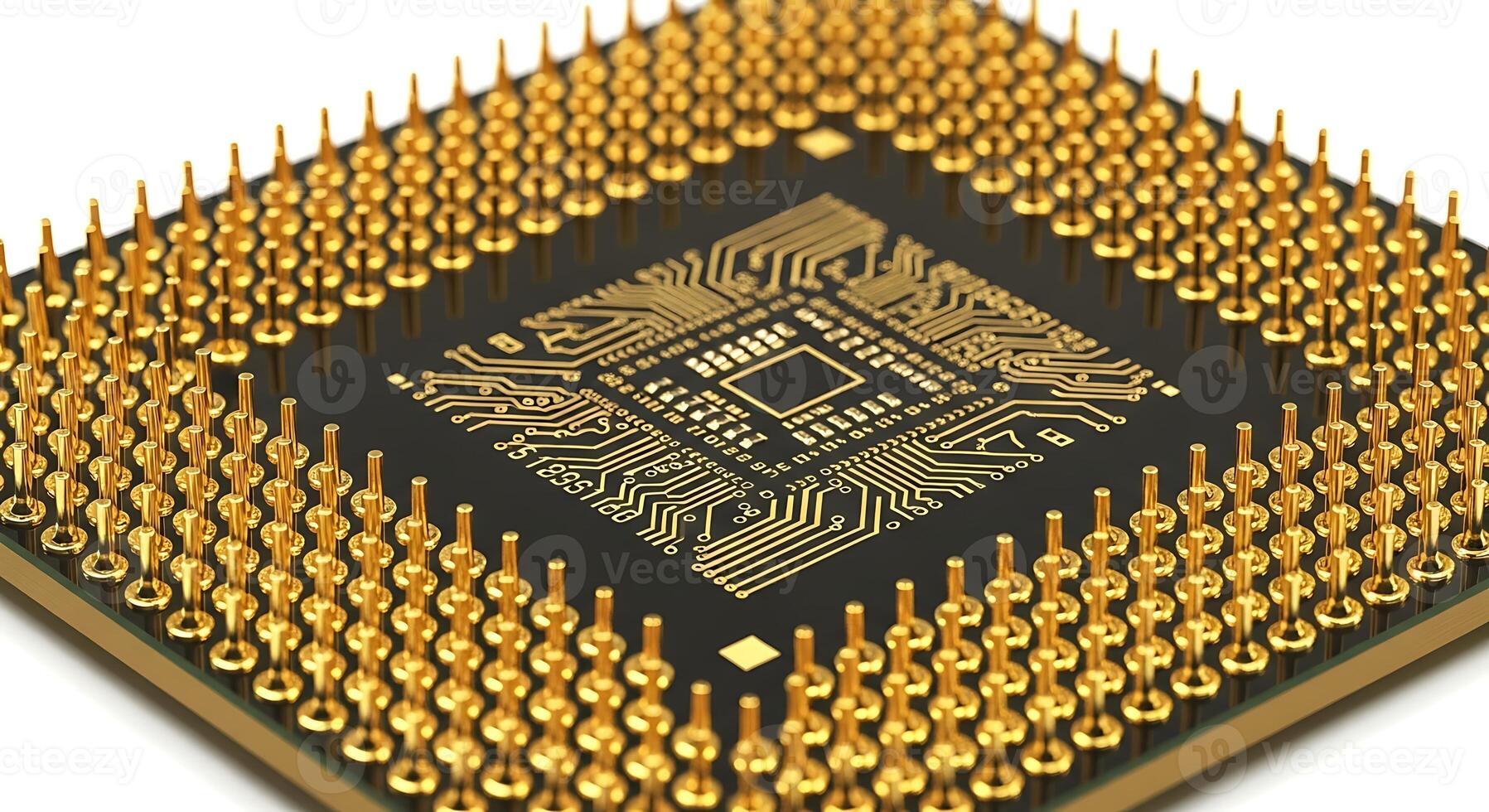Closeup view of a computer processor chip with golden pins and intricate circuitry Pro Photo