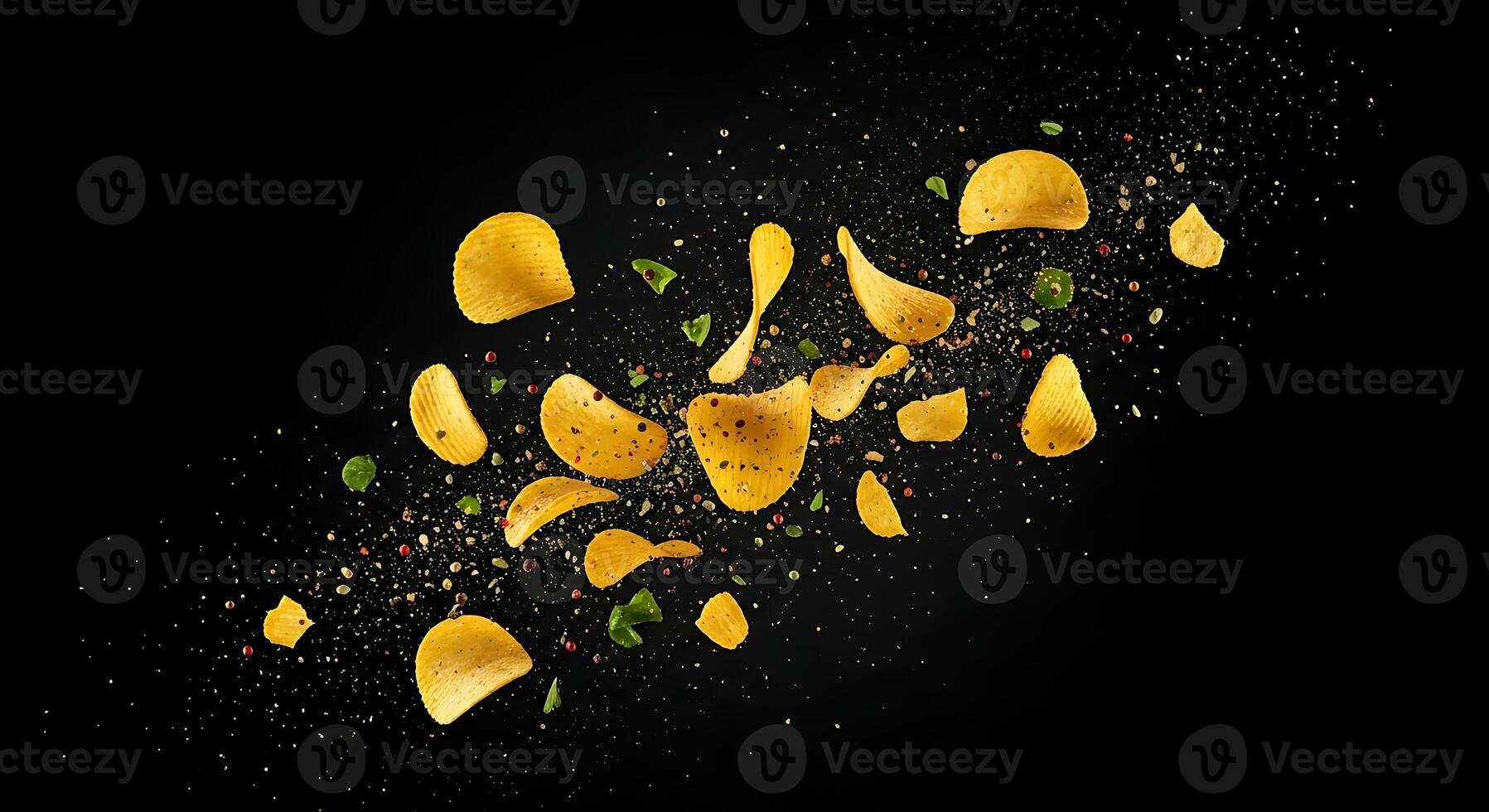 Explosion of seasoned potato chips and spices in midair against a stark black background, creating a dynamic and flavorful visual Pro Photo