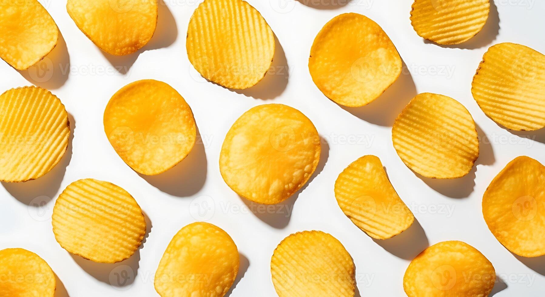 Crispy potato chips scattered on a white surface, some with ridges and some smooth, creating a textured pattern Pro Photo