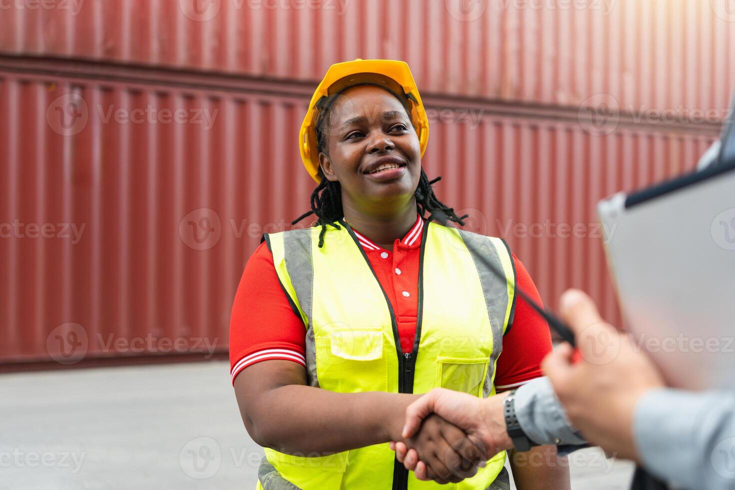 Worker and supervisor greeting and collaborating at freight terminal, Engineer and dock worker shaking hands at cargo container, Smiling industrial professionals building partnership at shipping port Pro Photo