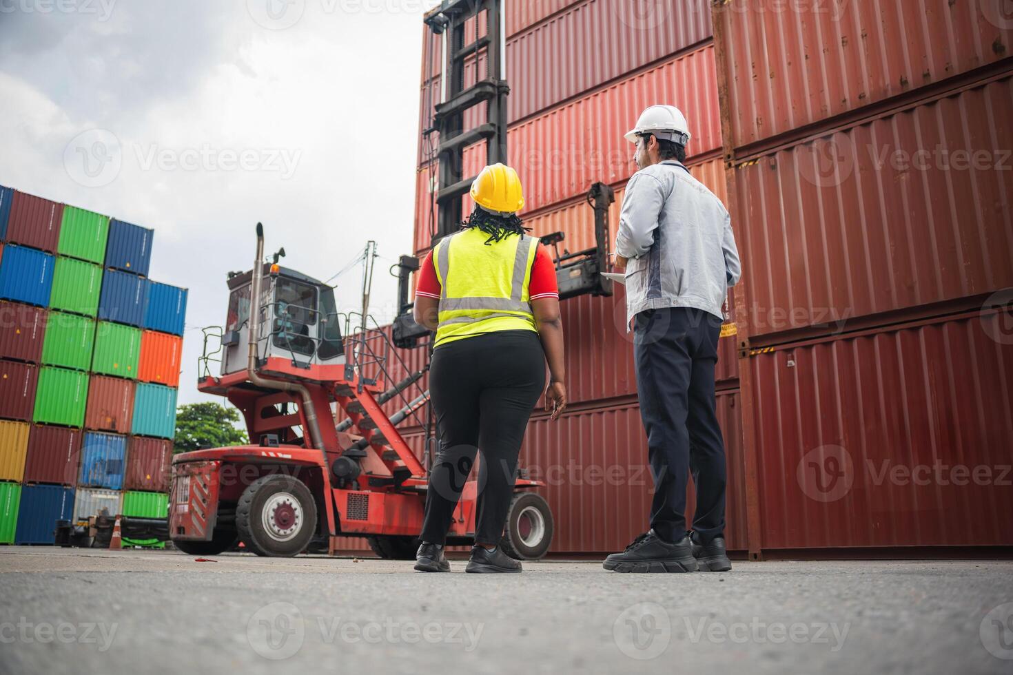 Diverse Logistics Engineers Observing Reach Stacker and Stacked Cargo Containers at Port Terminal, Supervisor and Foreman Checking Safety Protocols Before Loading Freight Pro Photo
