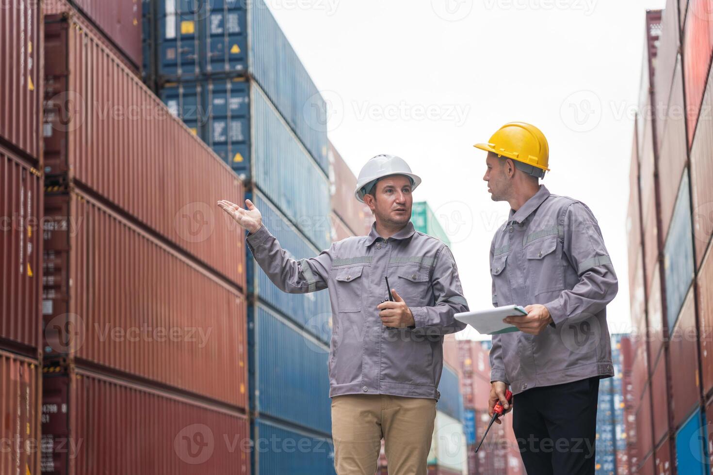Engineers man team managing cargo operations, Foreman dock workers checking containers box at shipping yard Pro Photo