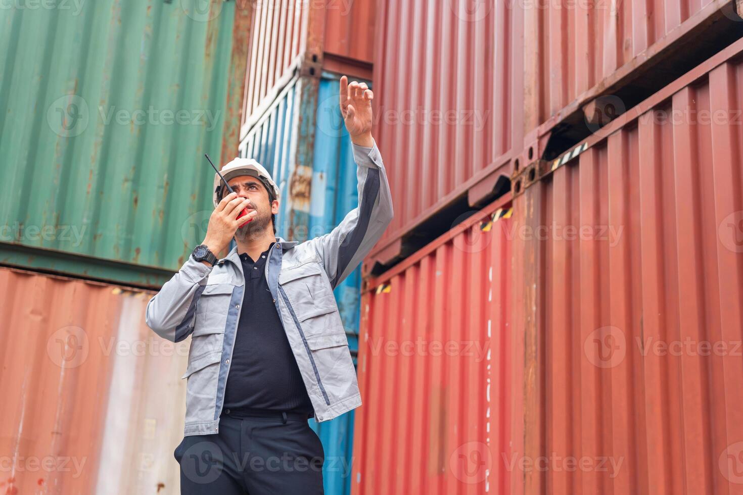 Foreman in Hard Hat Communicating on Walkie-Talkie in Container Shipping Yard, Port Worker Directing Operations, Engineer Giving Instructions via Two-Way Radio Pro Photo