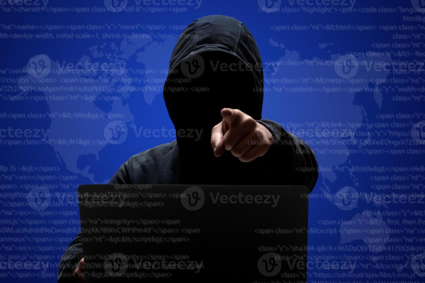 Male hacker with dark face in hoodie, stands in front of laptop computer, points at camera, steals data, downloads private information, poses against digital interface background. Cyberspace. Pro Photo