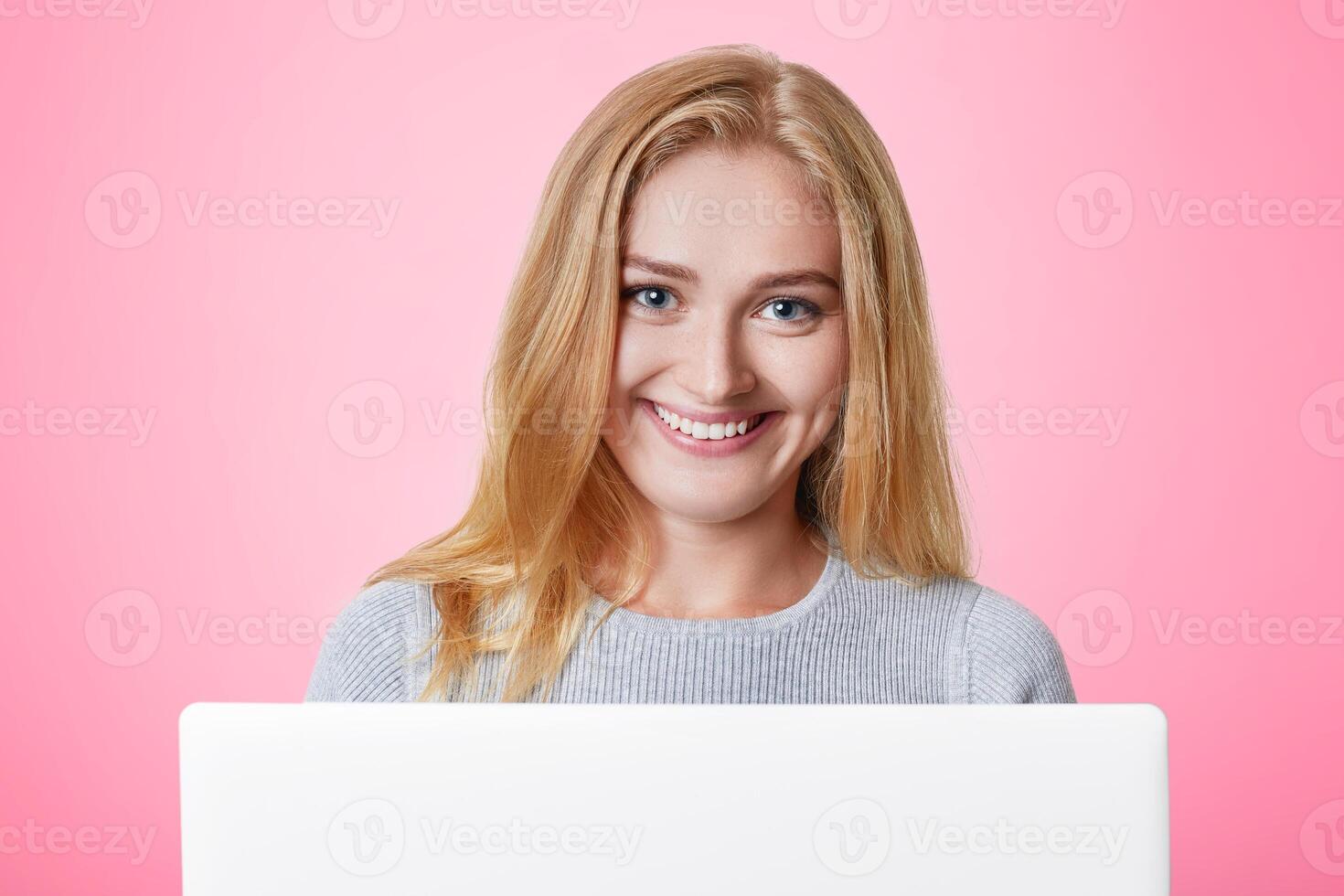Cheerful female model with happy expression smiles gladfully, uses laptop computer, surf social networks and recieves messages from friends, uses wireless internet connection. Technology concept Pro Photo