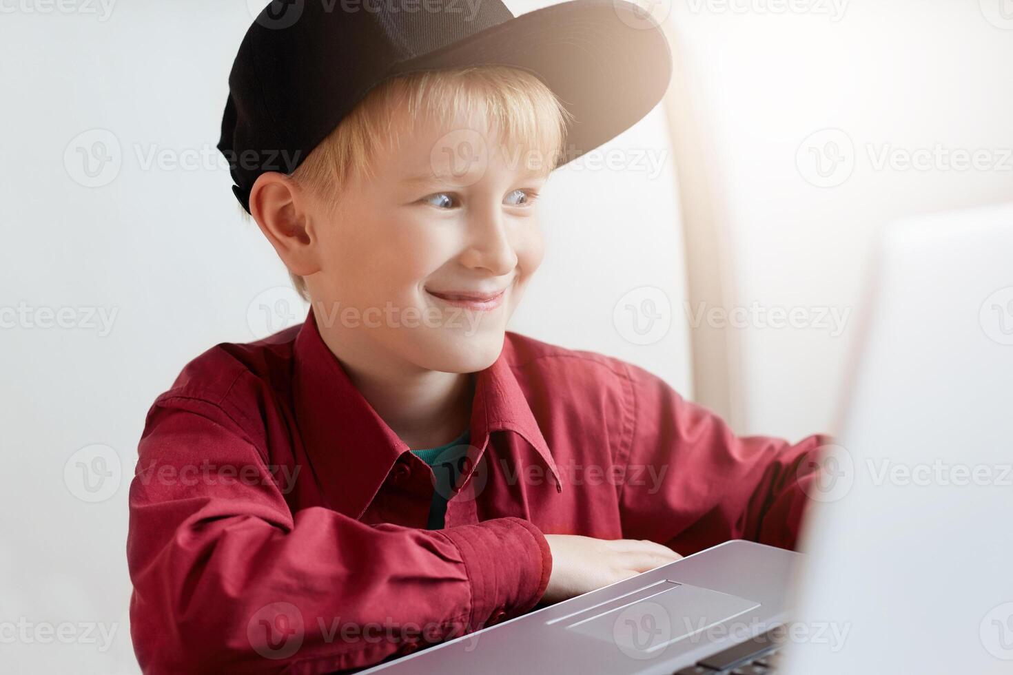 A happy little boy in trendy clothes relaxing during lunch at modern cafe, sitting in front of open laptop having surprised expression while watching funny videos online using free internet connection Pro Photo