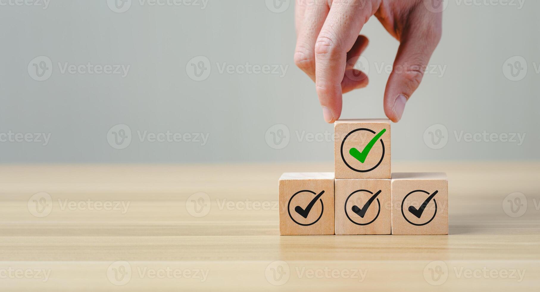 Checklist and quality assurance concept with wooden blocks stacked with check mark icons, symbolizing task completion, project approval, business standard, successful evaluation, process verification Pro Photo