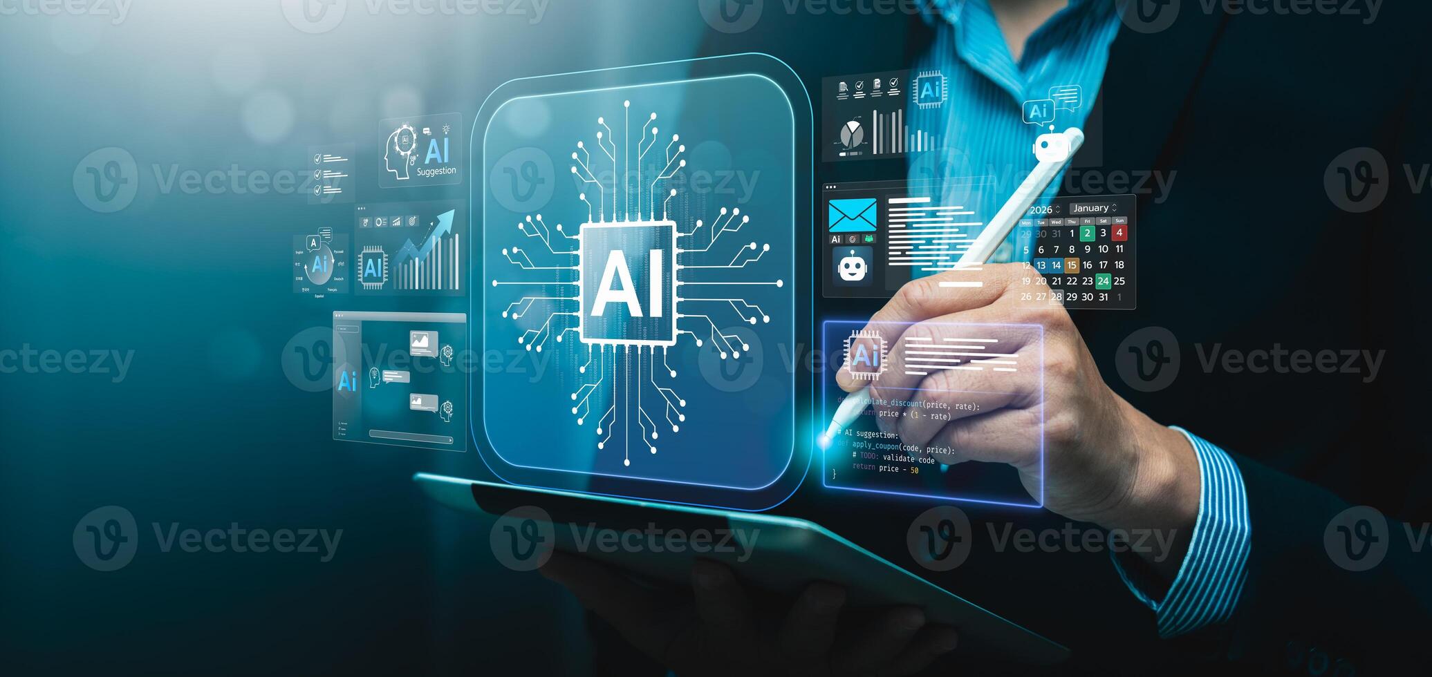 Artificial intelligence innovation in digital business with businessman using smart stylus and tablet to interact with virtual AI interface for data analysis, automation, predictive insight technology Pro Photo