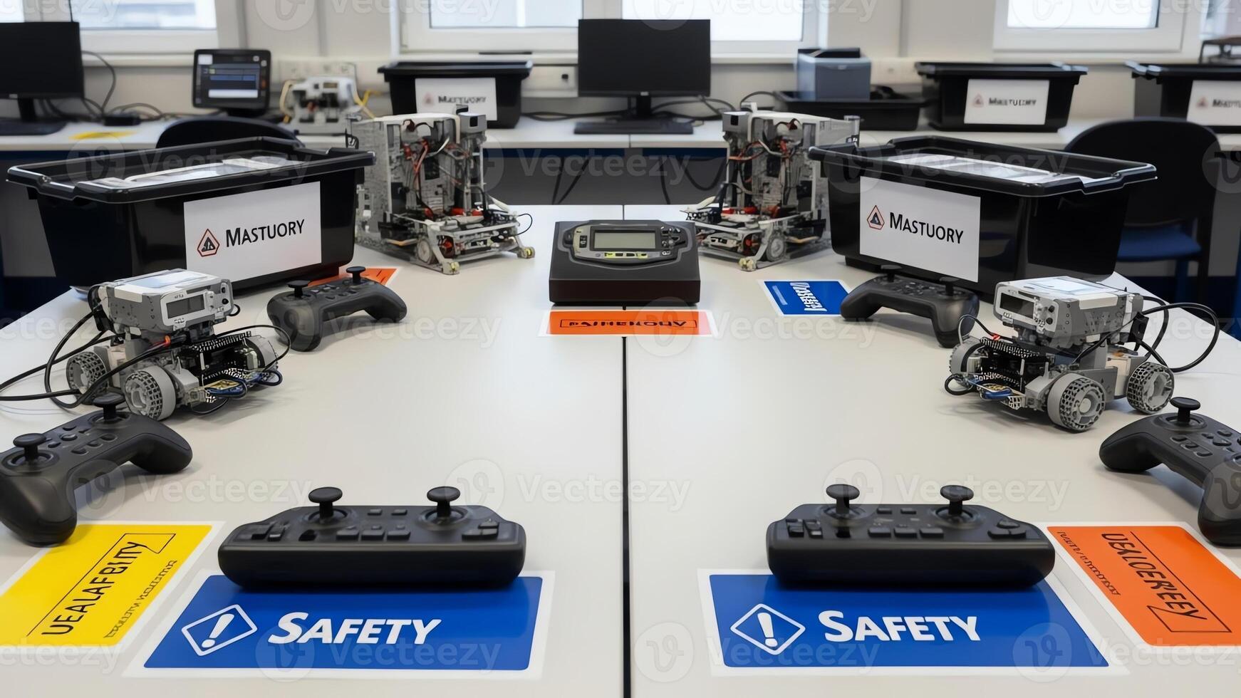 Robotics classroom setup with multiple robots and controllers for STEM education. Pro Photo