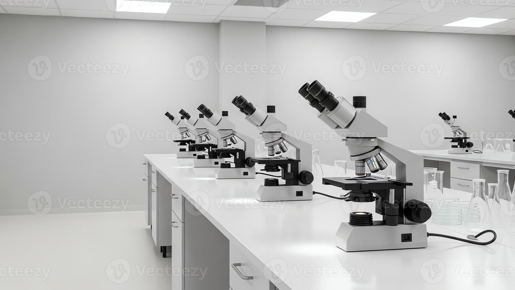 Modern Science Laboratory with Multiple Microscopes Lined Up on Tables. Pro Photo