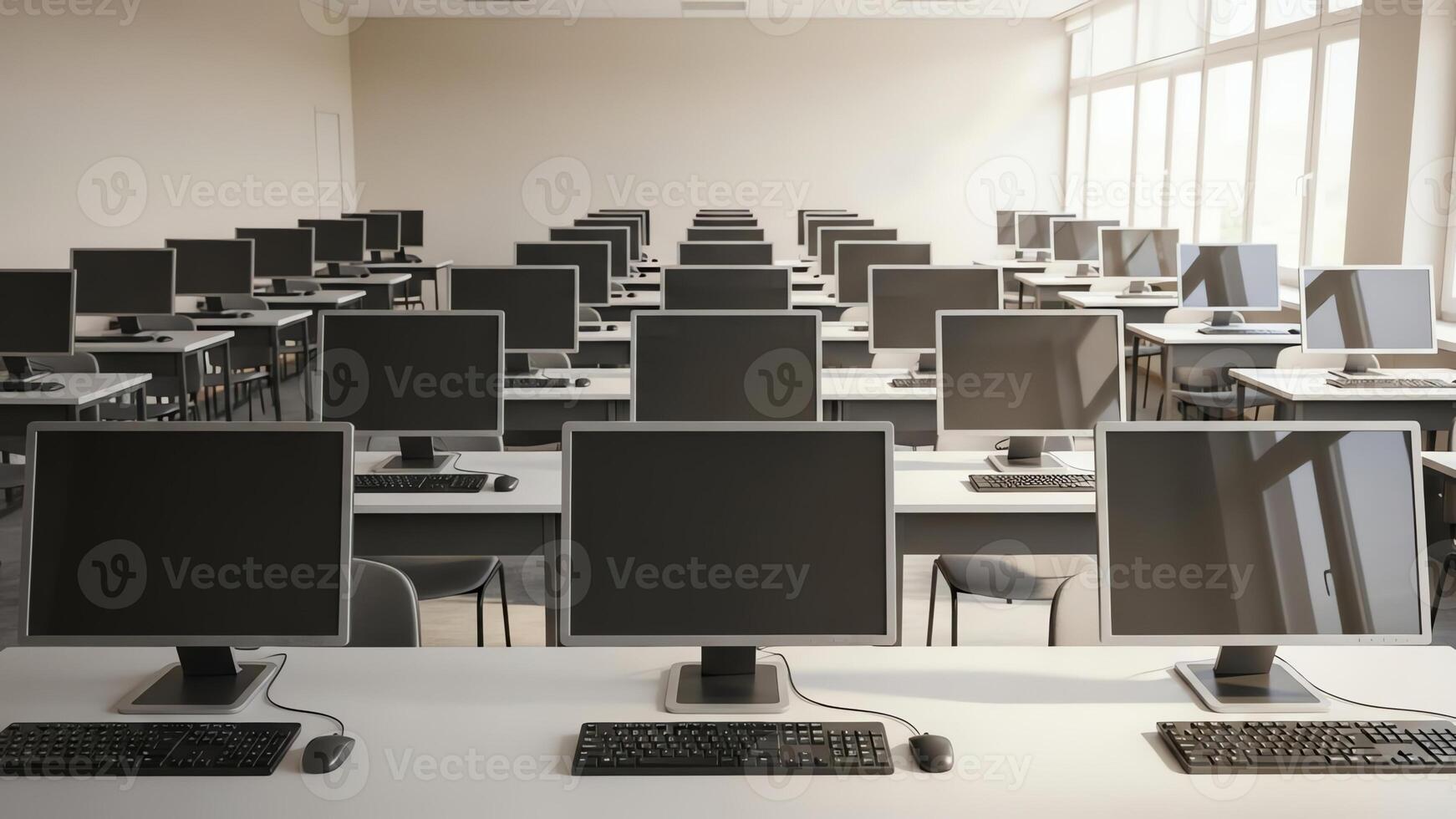 Empty Computer Classroom with Rows of Desks and Monitors. Pro Photo