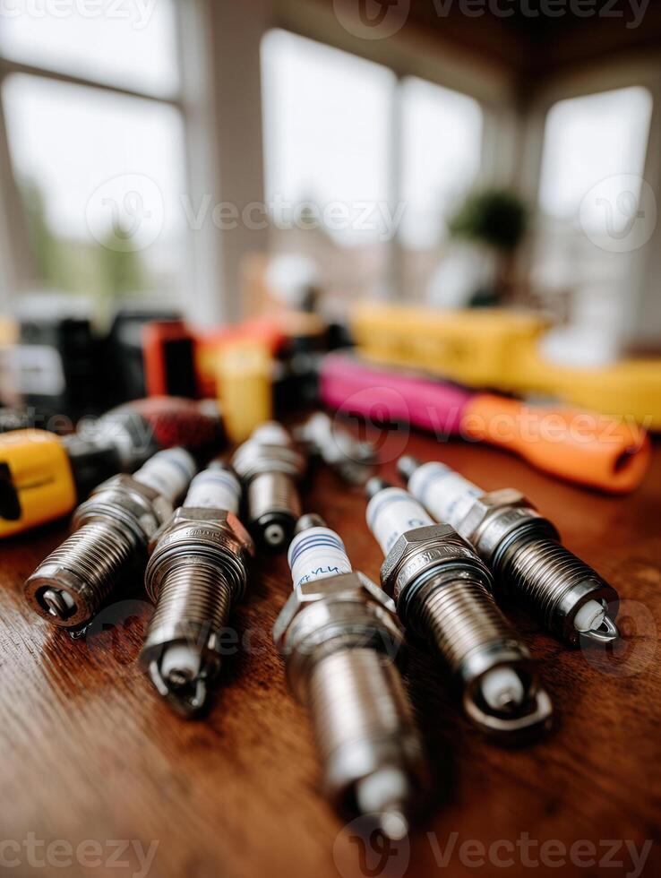 Close-up view of spark plugs and wrenches on a wooden table in a workshop setting during daylight hours Pro Photo