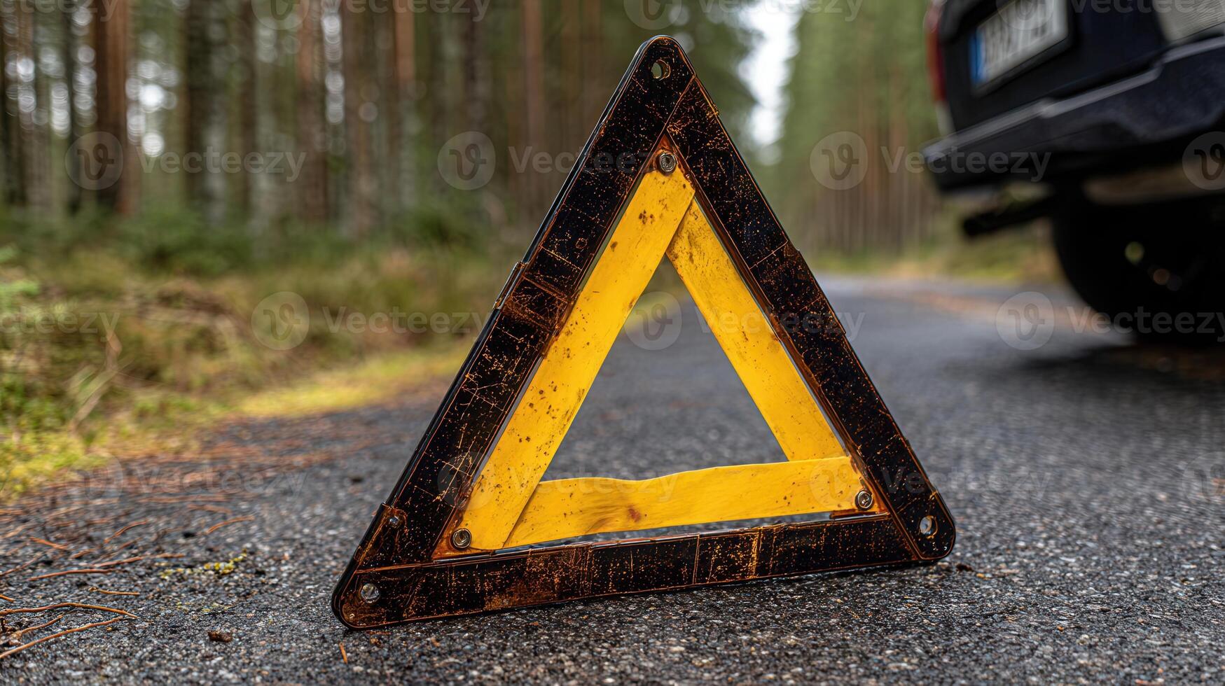 Reflective warning triangle placed on a roadside in a forested area to signal a vehicle breakdown during daytime Pro Photo