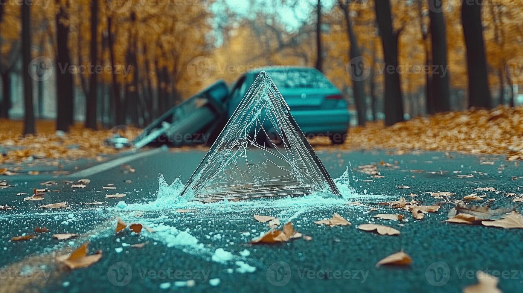 Warning triangle in focus while an abandoned car sits partially on the road surrounded by autumn leaves in a quiet forest setting Pro Photo