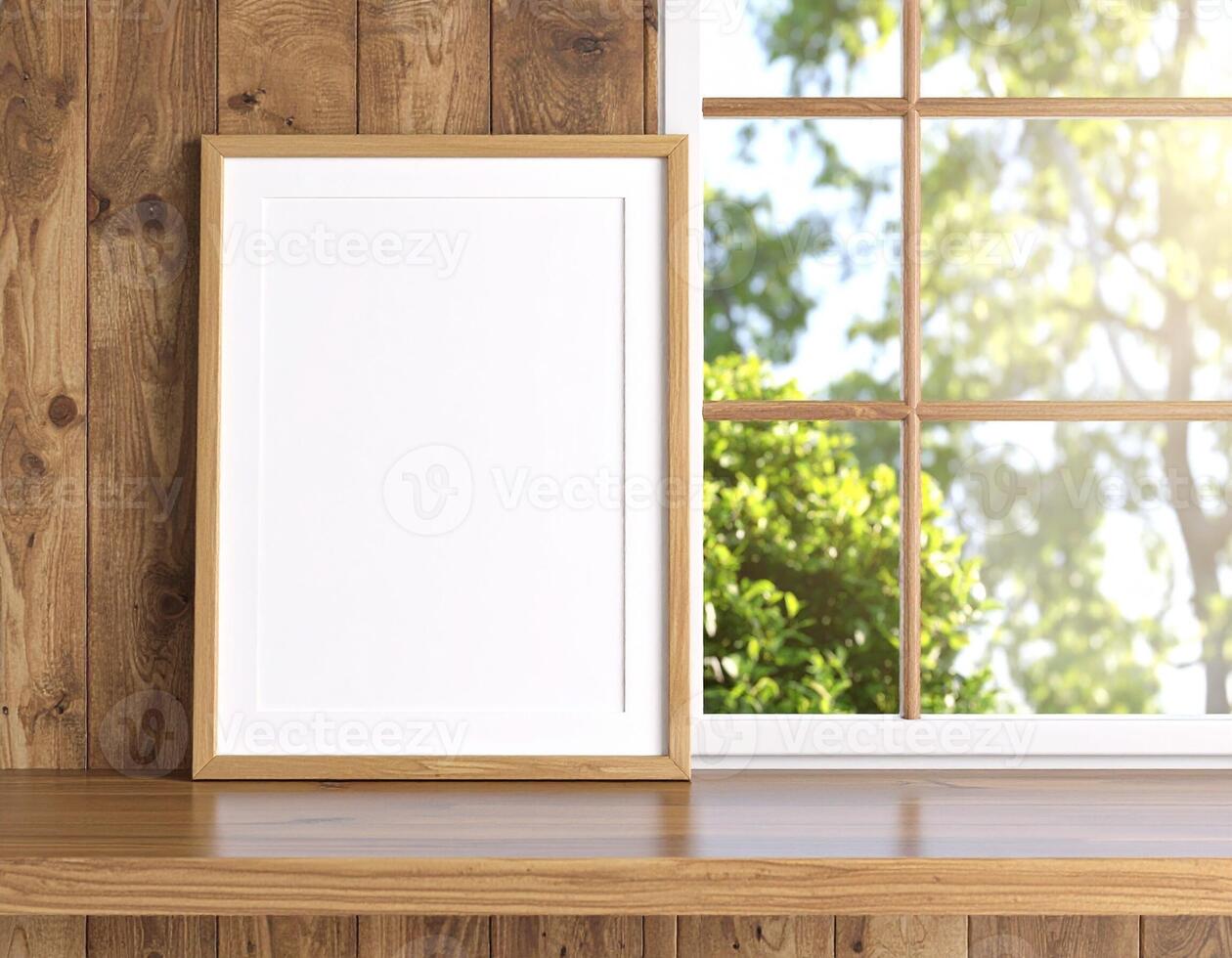 Empty vertical wooden frame mockup on a rustic shelf next to a sunny window with a view of green trees. Pro Photo