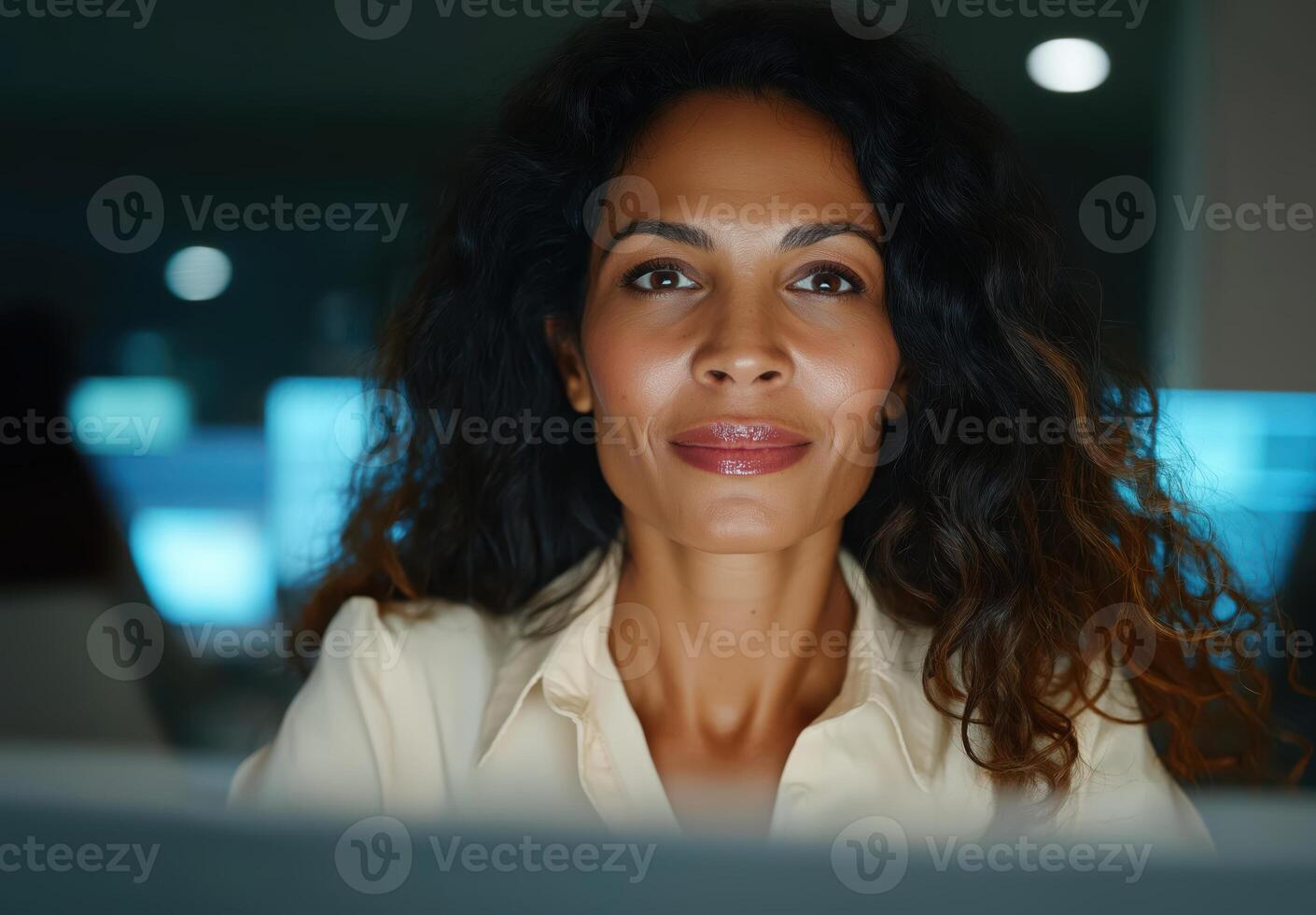 IT support engineer focuses on tasks while illuminated by blue lights in a darkened office environment Pro Photo