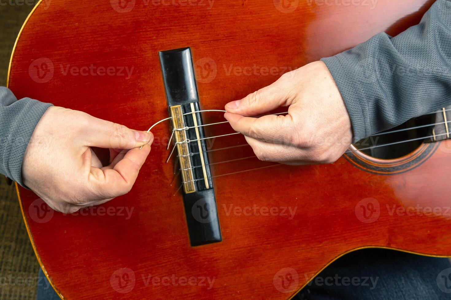 Detailed image of a person hands installing fresh strings on a vibrant red guitar, highlighting the bridge and precision of the restringing process Pro Photo