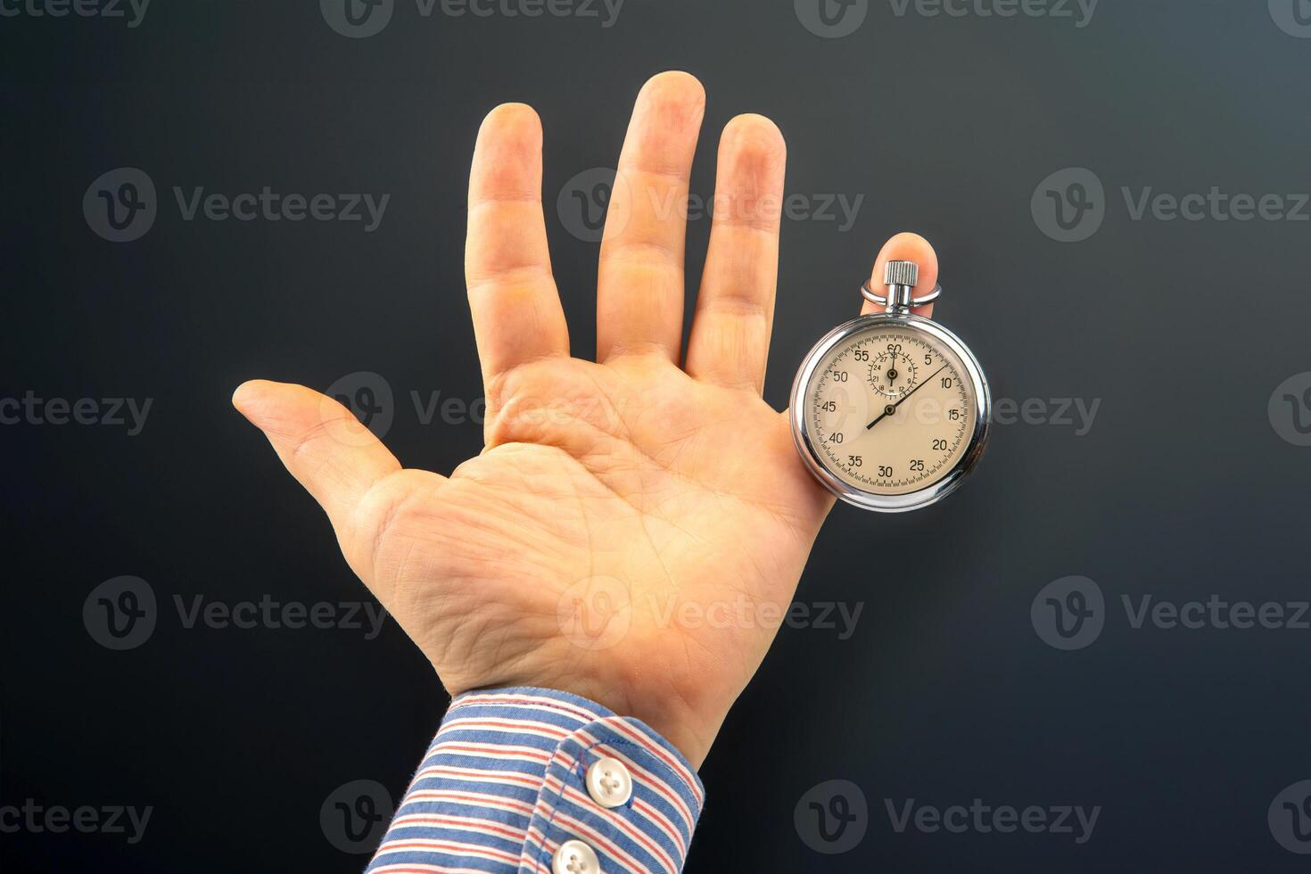 The hand with a mechanical analog stopwatch on a dark background. Time part precision. Measurement of the speed interval Pro Photo