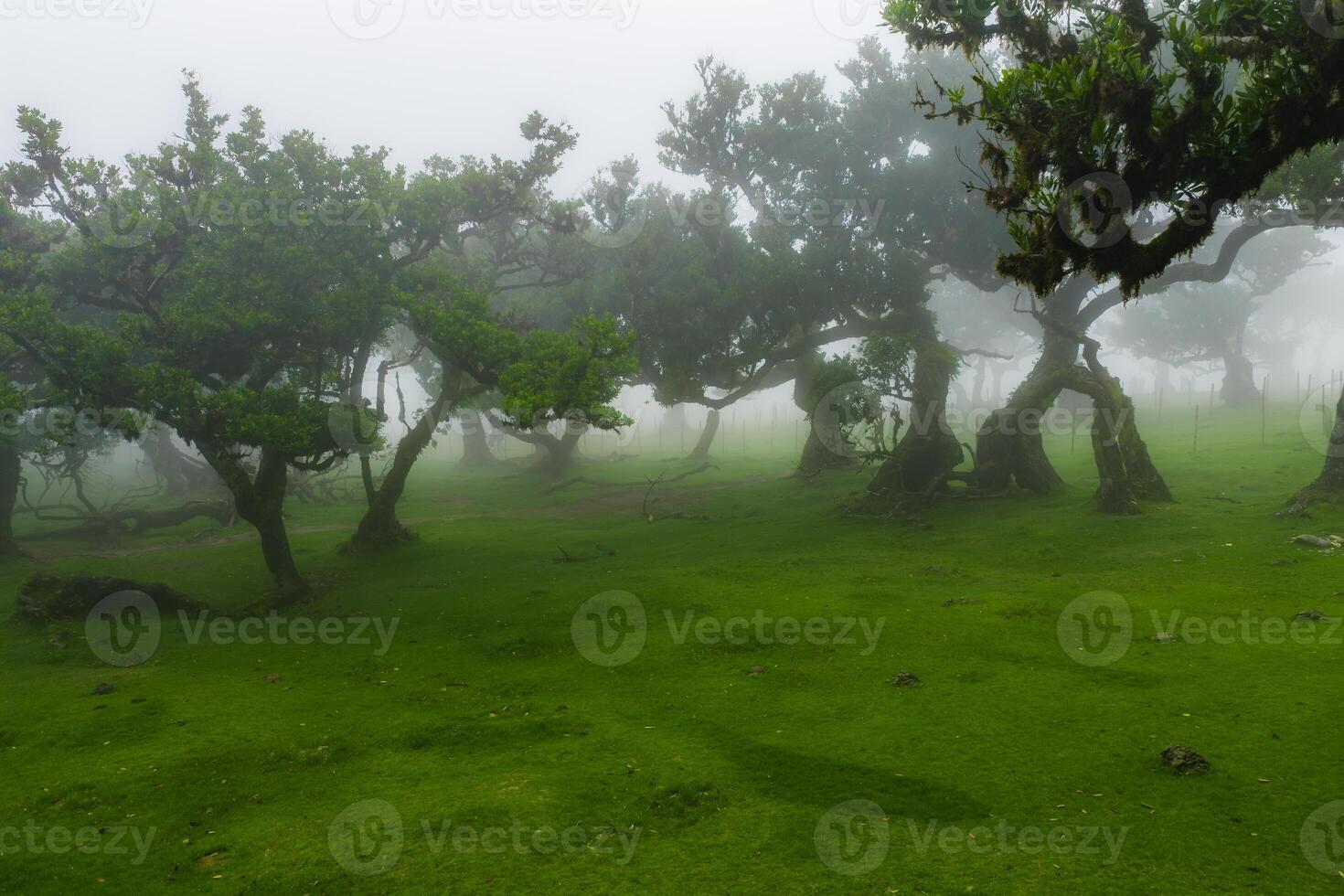 Ancient laurel trees stand in fog at Fanal Forest in Madeira, Portugal. Gnarled trunks rise from moss in cool diffuse light with shallow visibility and calm mood. Pro Photo