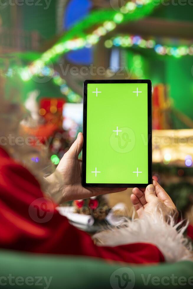 Saint Nicholas using chroma key tablet to reply to Christmas requests sent online by children. Santa Claus using isolated screen device to check email inbox for digital letters from kids Pro Photo