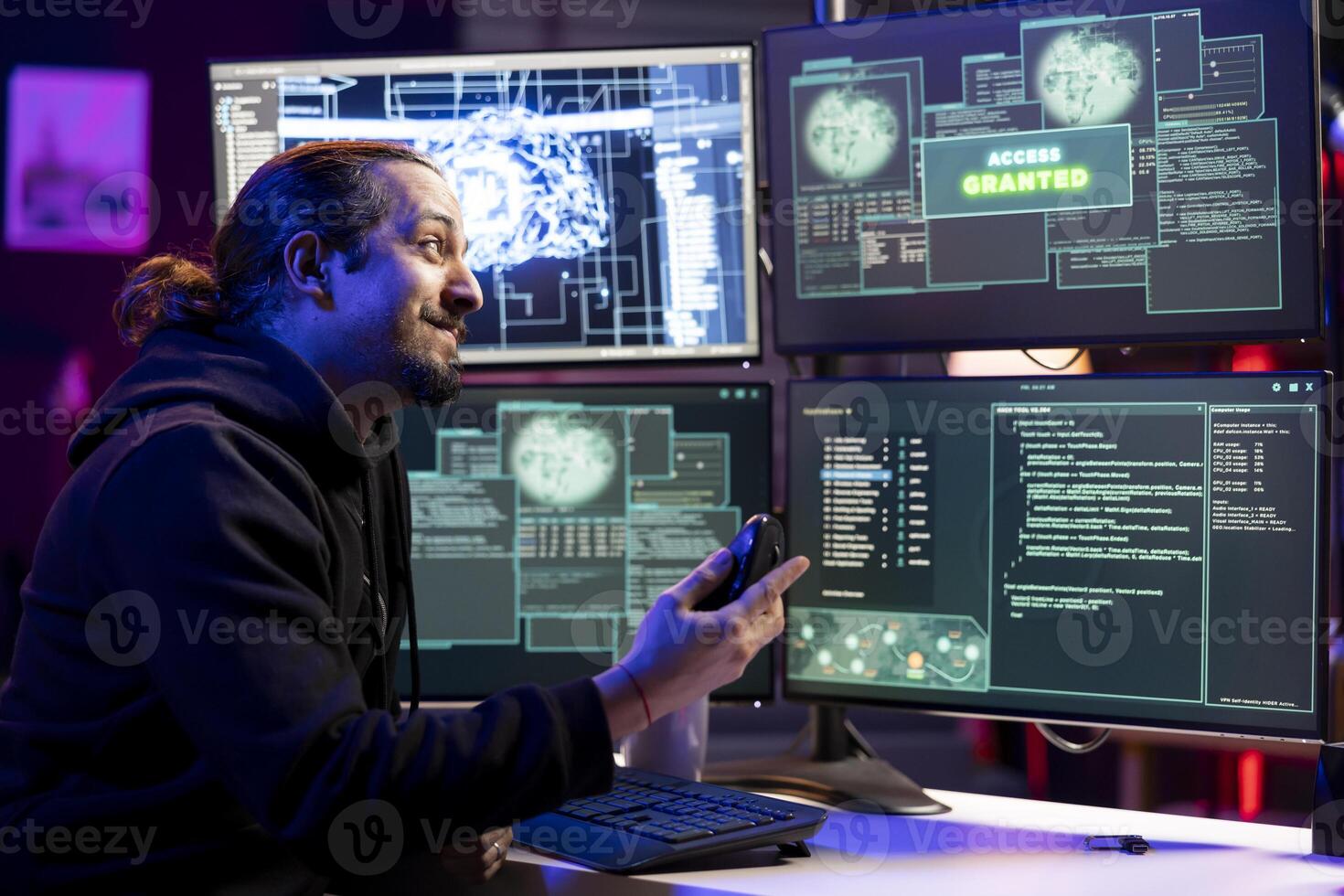 Smiling hacker pleased after launching phishing attacks tricking users into revealing credit card data. Cheerful man excited after DDoS attacks flood servers and crash websites Pro Photo