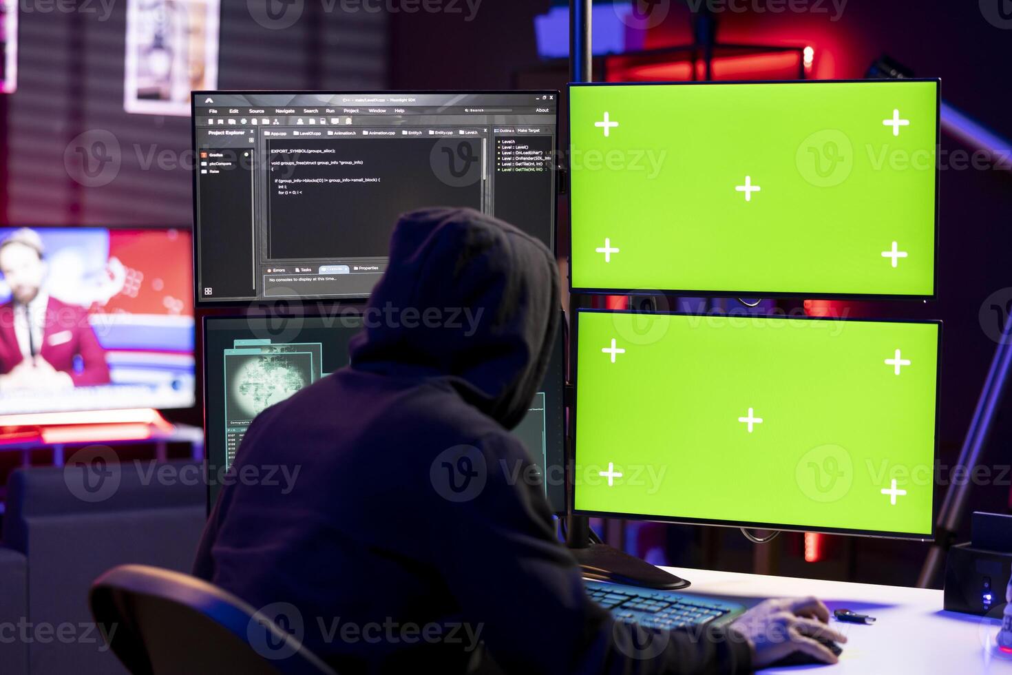 Hacker does phishing attacks using isolated screen multi monitor setup, tricking users into revealing credit card data. Man launches DDoS attacks with chroma key PC, flooding servers to crash websites Pro Photo