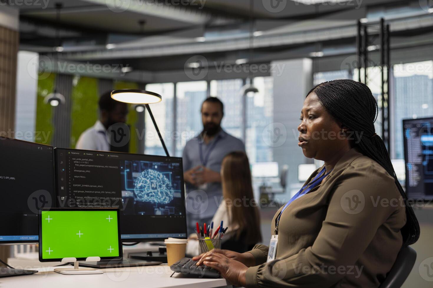 Admin writing code snippets on chroma key tablet in modern office, adjusting program configurations. Woman running diagnostic tools app on isolated screen device, monitoring API cloud services Pro Photo