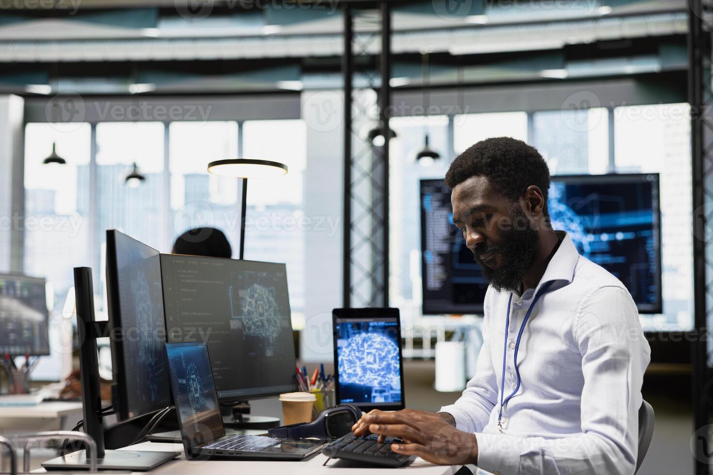 Engineer at work relying on AI technology to finish tasks, concept of overdependence on artificial intelligence tools reducing human decision making. Reliance on AI automation diminishing skills Pro Photo