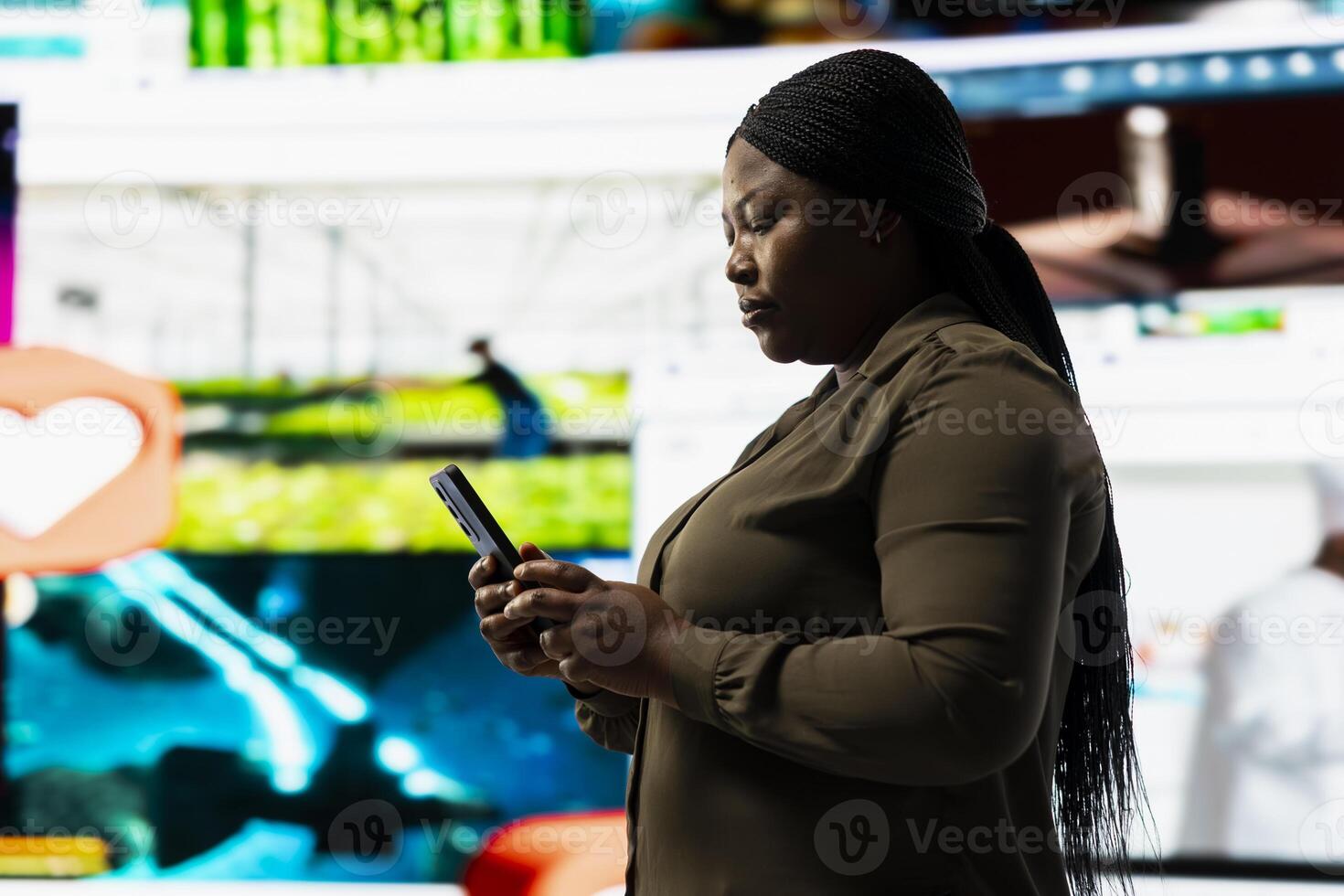 Woman scrolling through social networks feed on smartphone in front of digital wall showcasing multimedia content. Viewer using mobile phone, entertained by diverse multimedia clips Pro Photo