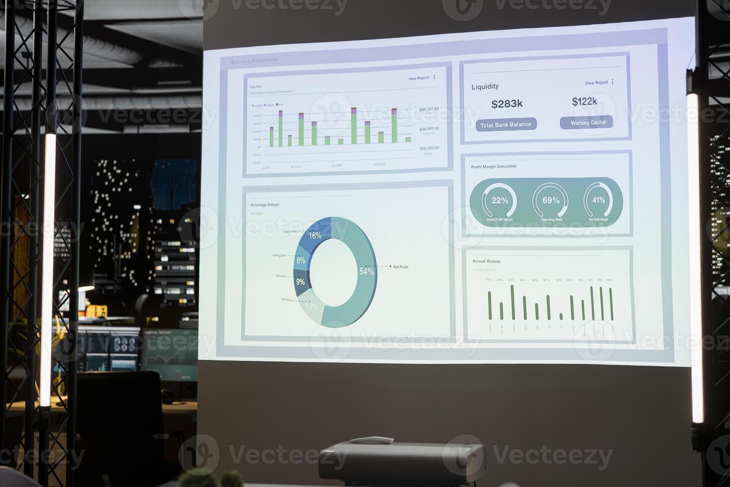 Empty night time office features modern tech displaying analytics, forecasting tools ensure business strategy success. Data icons and performance metrics support professional growth. Pro Photo