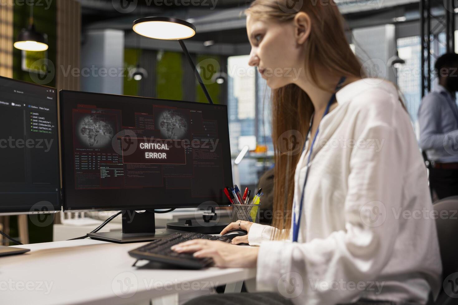Troubled software developer reviewing error logs at work, trying to to resolve critical glitches. Tense young inexperienced worker debugging code in office, looking for solutions to fix errors Pro Photo