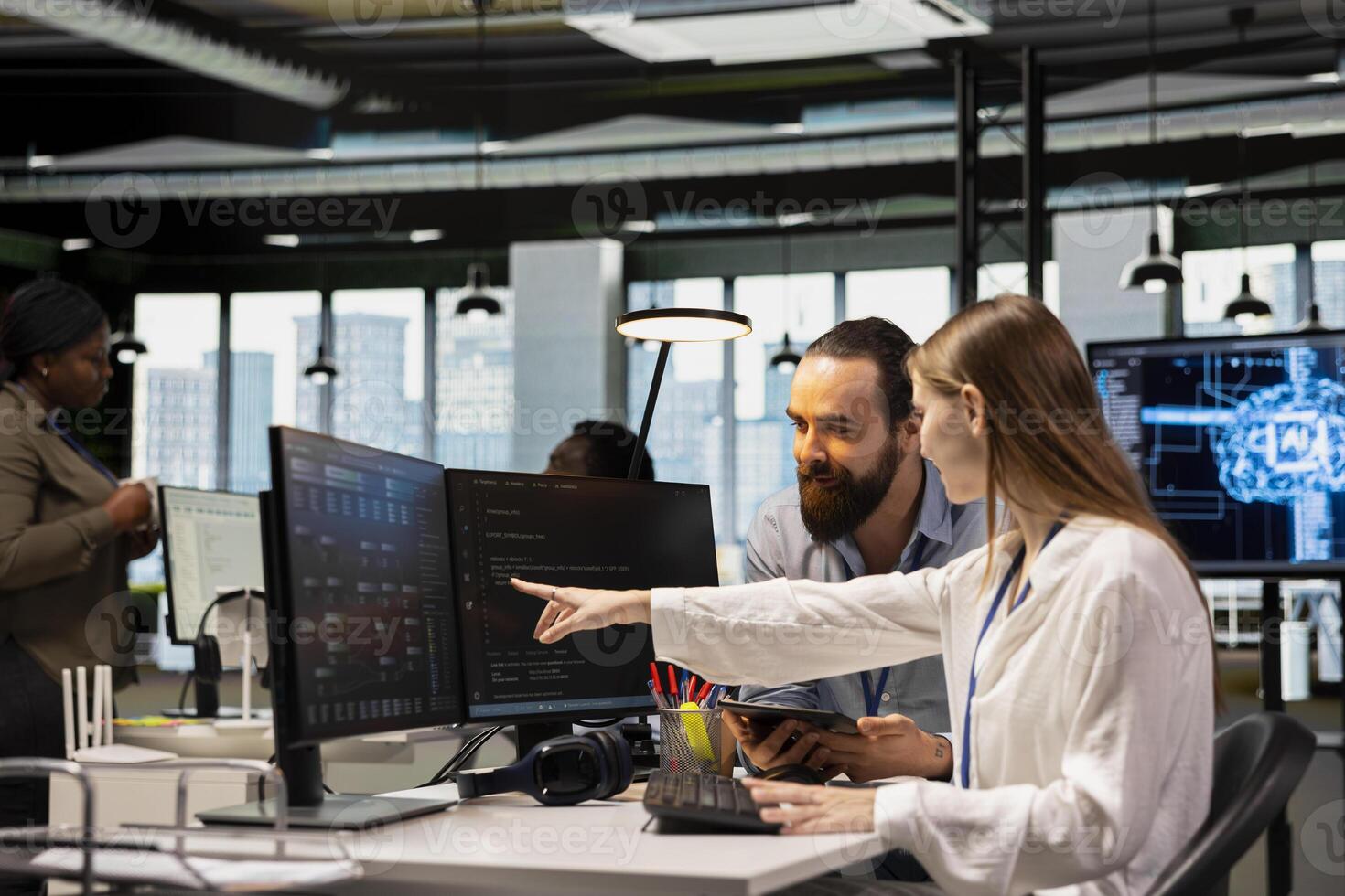 Friendly team leader mentor explaining young software engineer how to use AI tech. Joyous supervisor guiding office newcomer through AI tool integration, mentoring her on using neural networks APIs Pro Photo