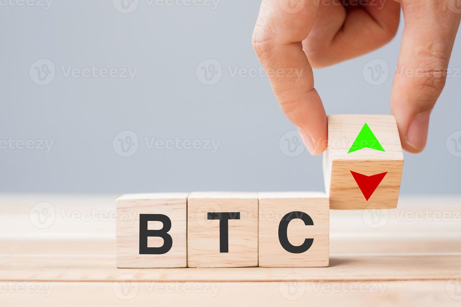 business man Hand change wood cube block with BTC Bitcoin text to UP and Down arrow symbol. cryptocurrency is Digital Money within the blockchain network Pro Photo