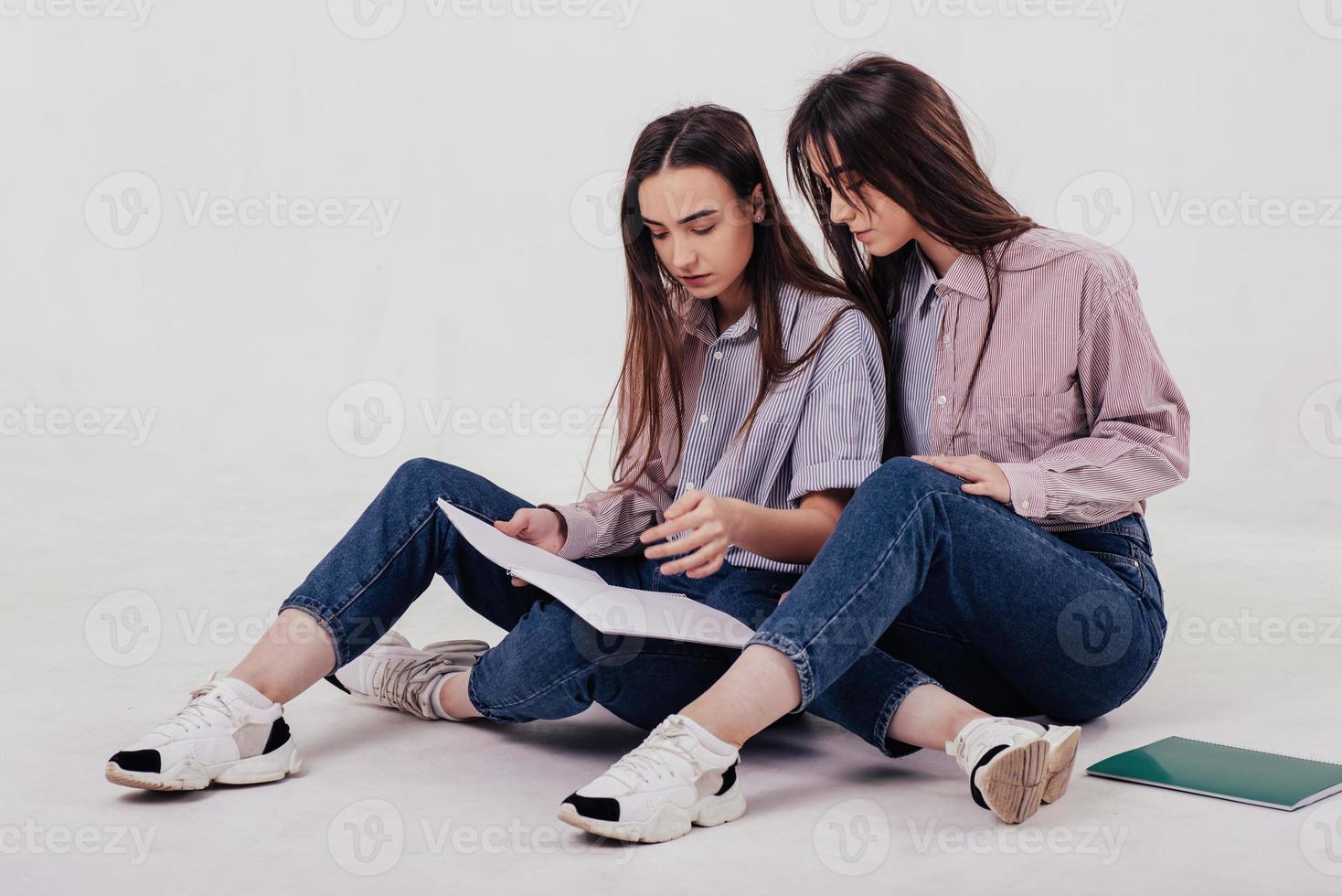 Sits on the floor and reading some information from the notepad. Two sisters twins sitting and posing in the studio with white background Pro Photo