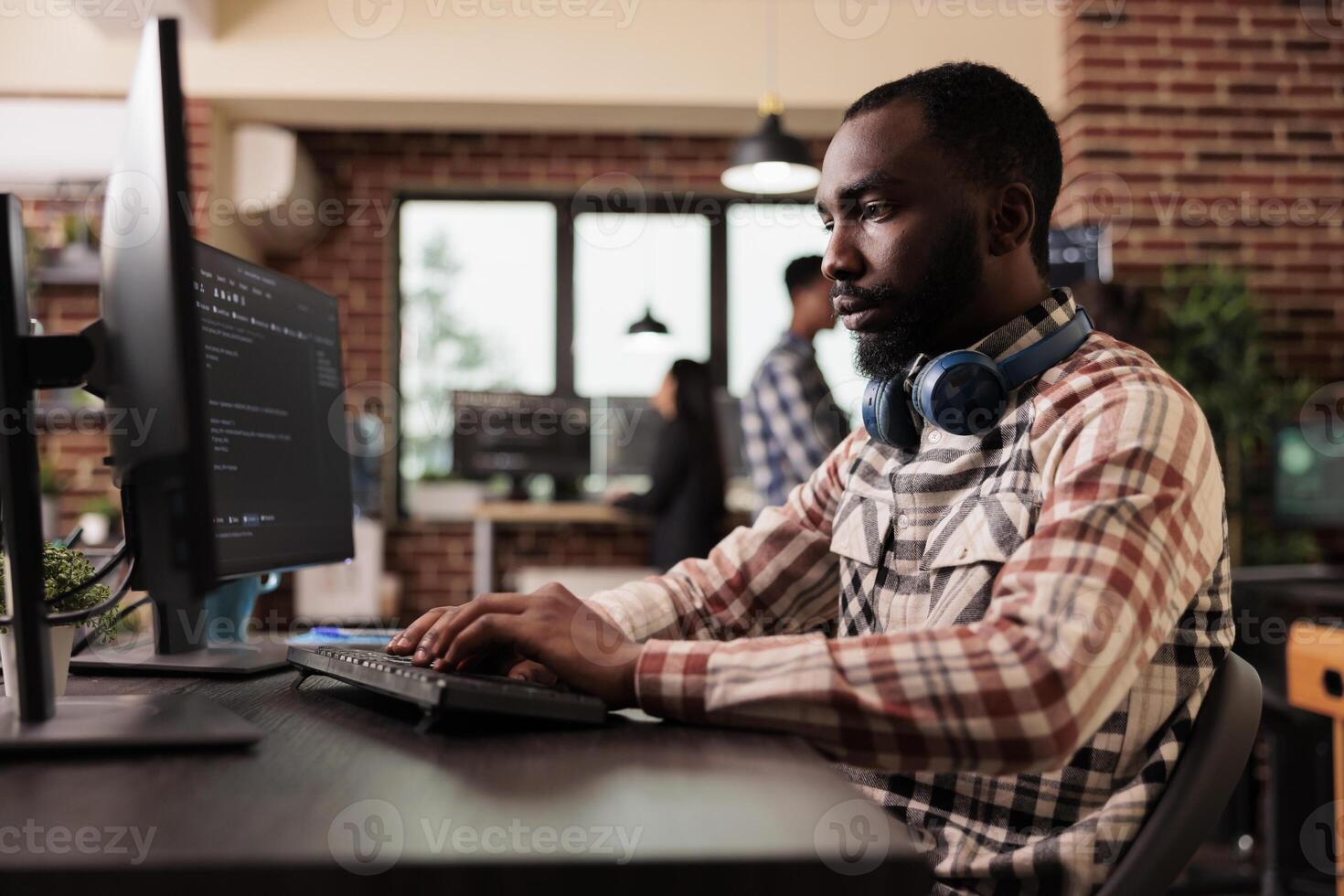 Freelance coder typing javascript code on computer to develop online cloud computing information. Software developer writing html script and data algorithm, working in it programming office Pro Photo