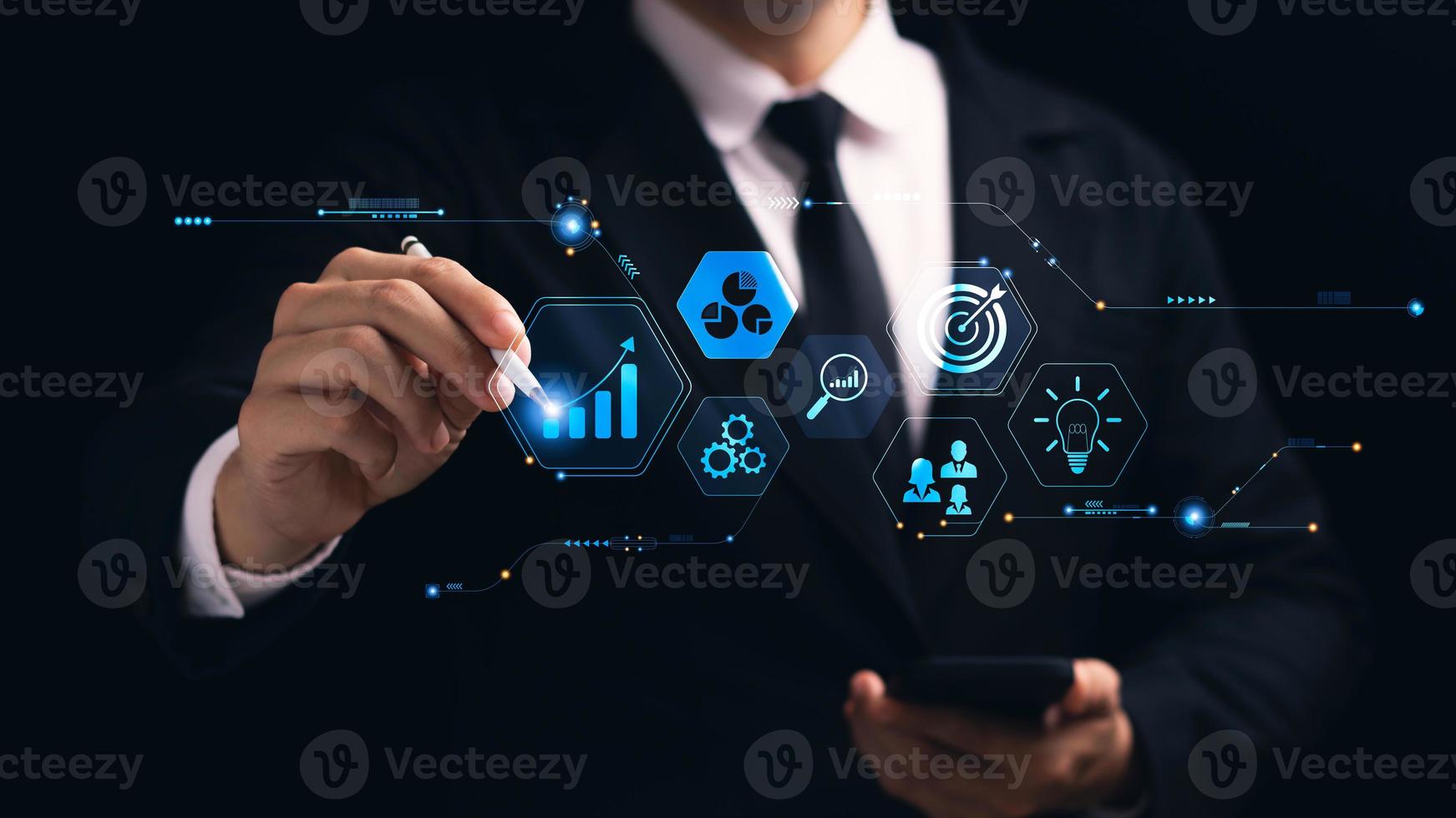 concept of long-term business development and management Executives looking at virtual screens business graph icon Goal setting, problem-solving, workflows, optimal business operations and innovation. Pro Photo
