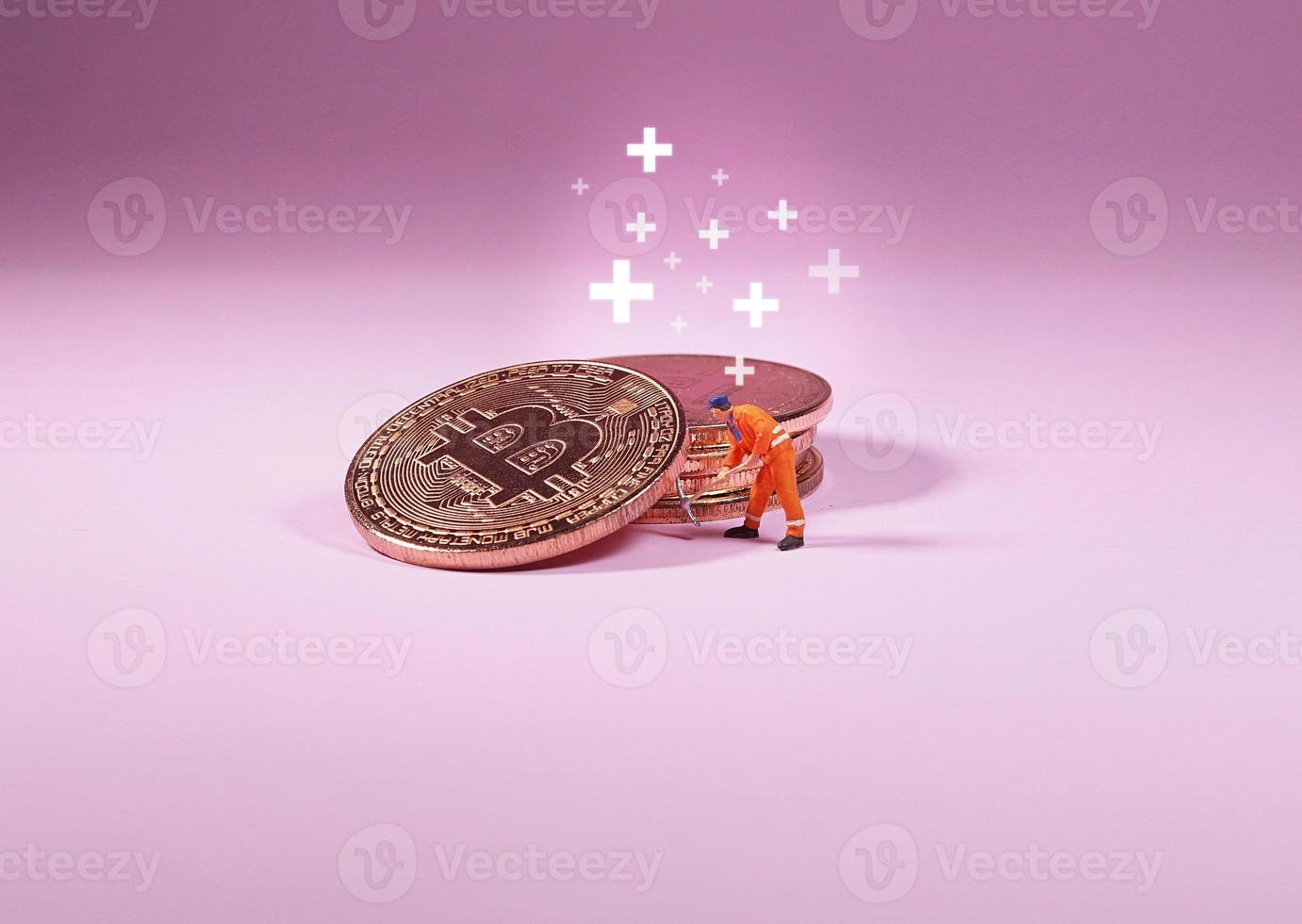 Technician worker figure standing in front of bitcoin. Bitcoin mining concept. Pro Photo
