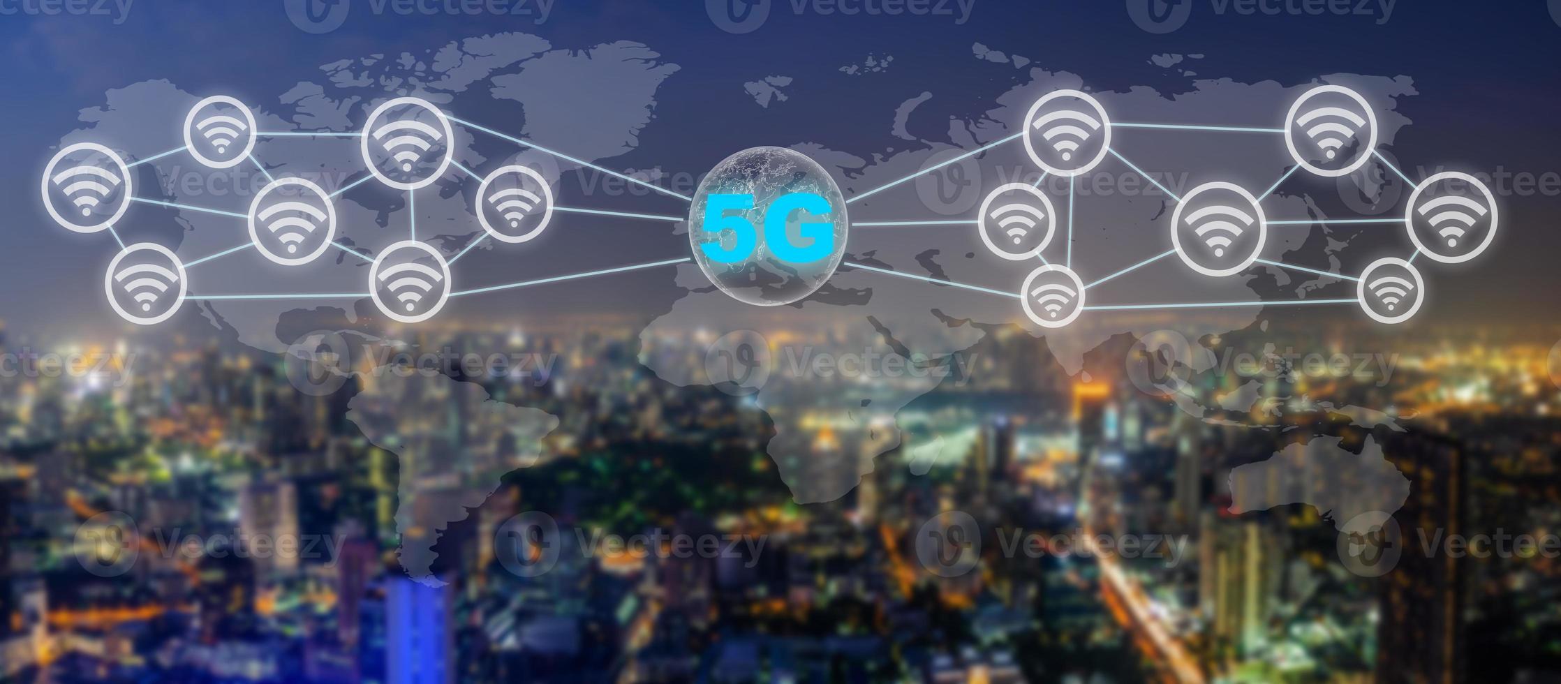 Communication network concept 5G and internet of things with smart city on night background. Modern city with wireless network connection concept, 5G network interface and wifi icon concept Pro Photo