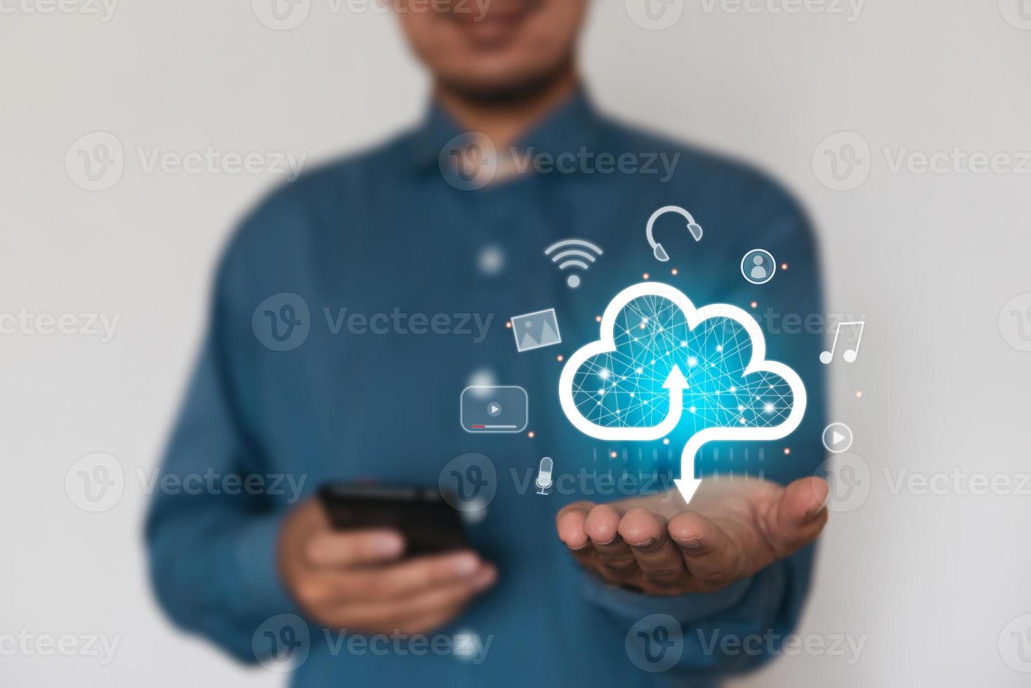Businessman holding a cloud data icon with light. Computing data on network. Insurance Business computer security concept. Pro Photo