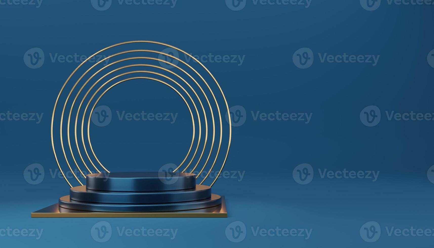 Empty 3 blue cylinder podium with gold border and gold cube on blue background. Abstract minimal studio 3d geometric shape object. Mockup space for display of product design. 3d rendering. Pro Photo