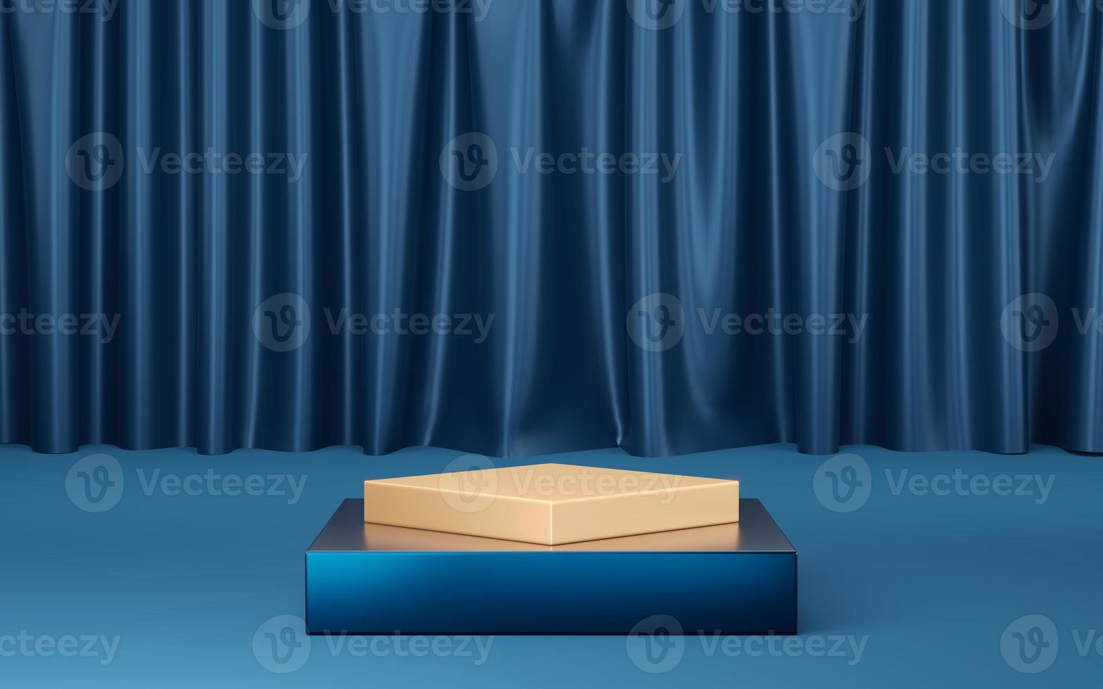 Empty blue and gold cube podium on blue background. Abstract minimal studio 3d geometric shape object. Mockup space for display of product design. 3d rendering. Pro Photo