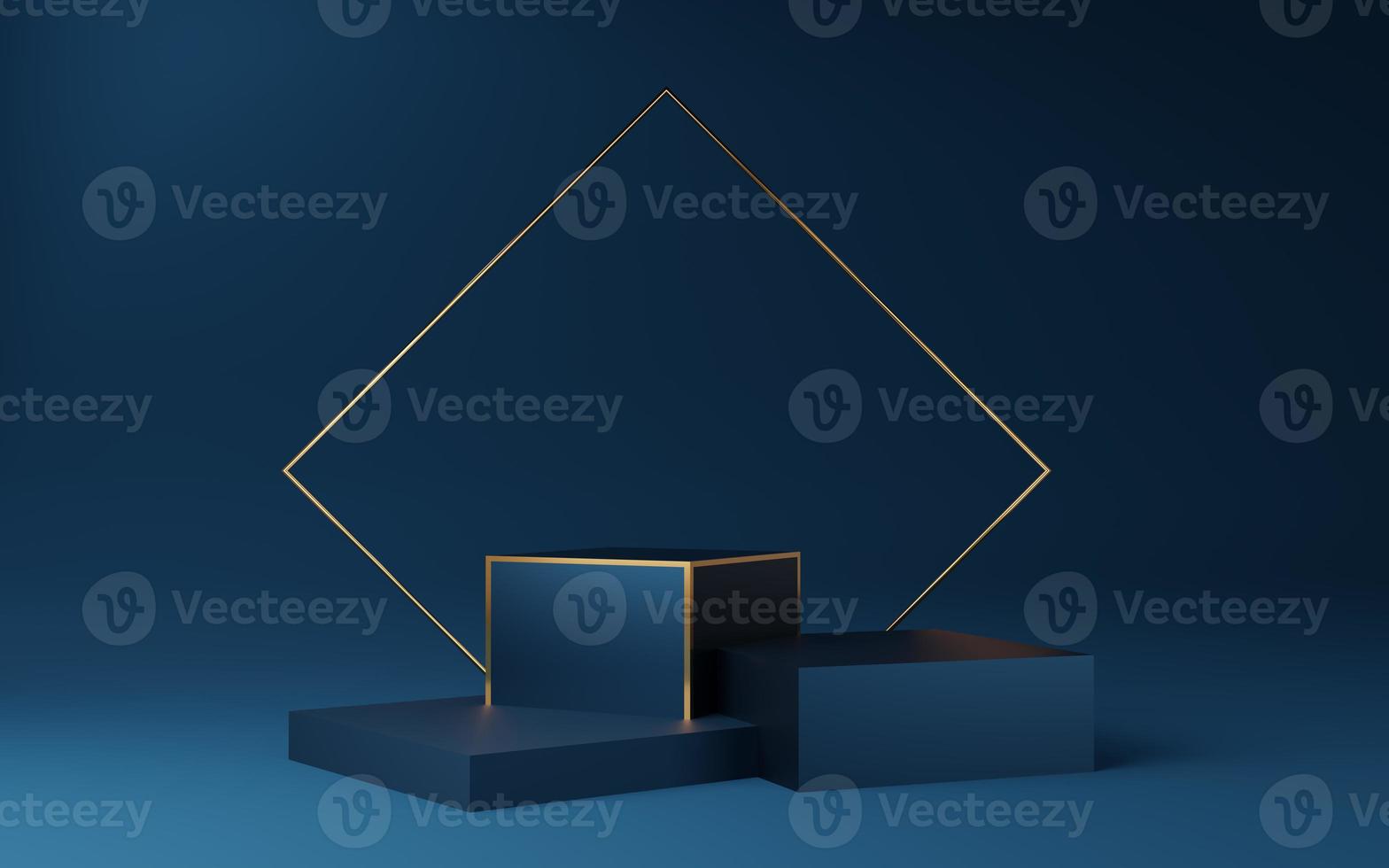 Empty blue cube podium with gold border and gold square on blue background. Abstract minimal studio 3d geometric shape object. Mockup space for display of product design. 3d rendering. Pro Photo