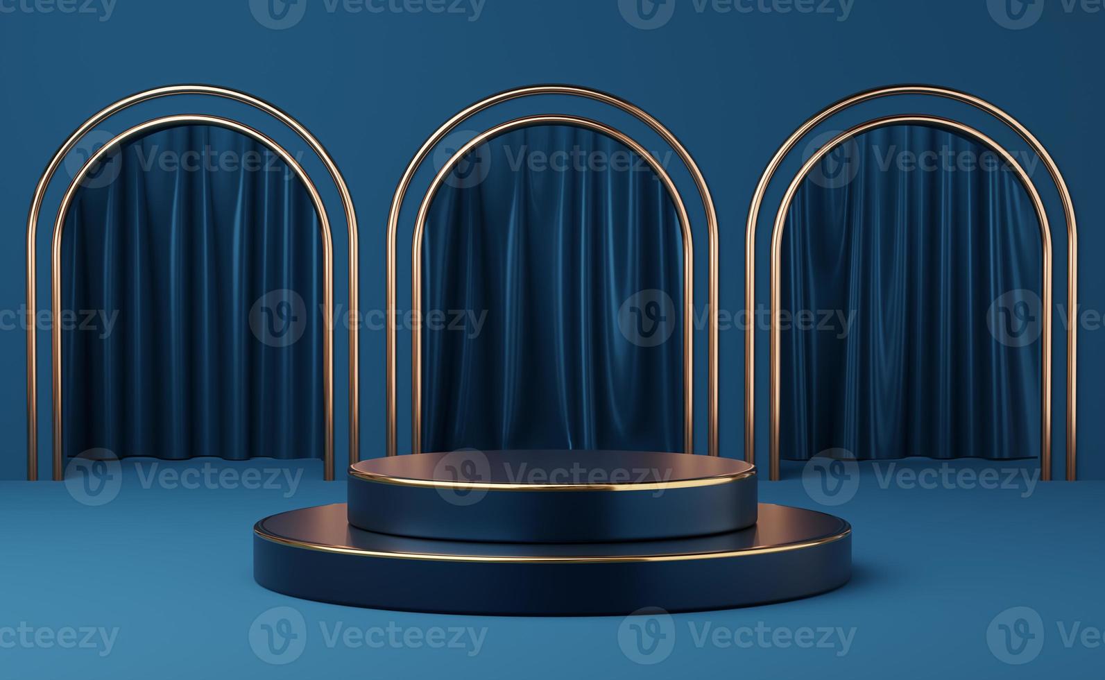 Empty blue cylinder podium on gold border arch blue curtain background. Abstract minimal studio 3d geometric shape object. Mockup space for display of product design. 3d rendering. Pro Photo