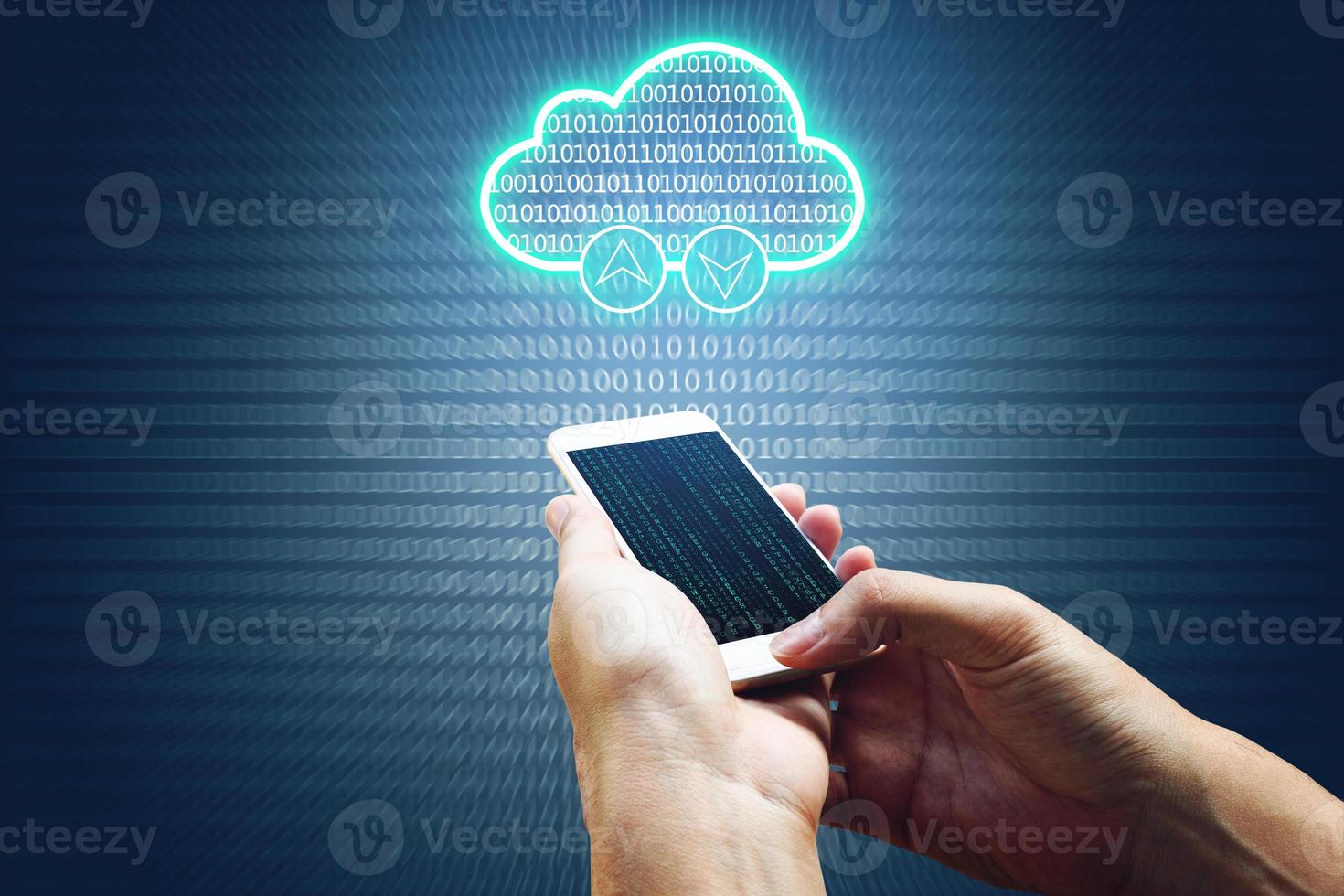 Cloud computing connectivity concept and hand man using smartphone network system and binary background. Pro Photo