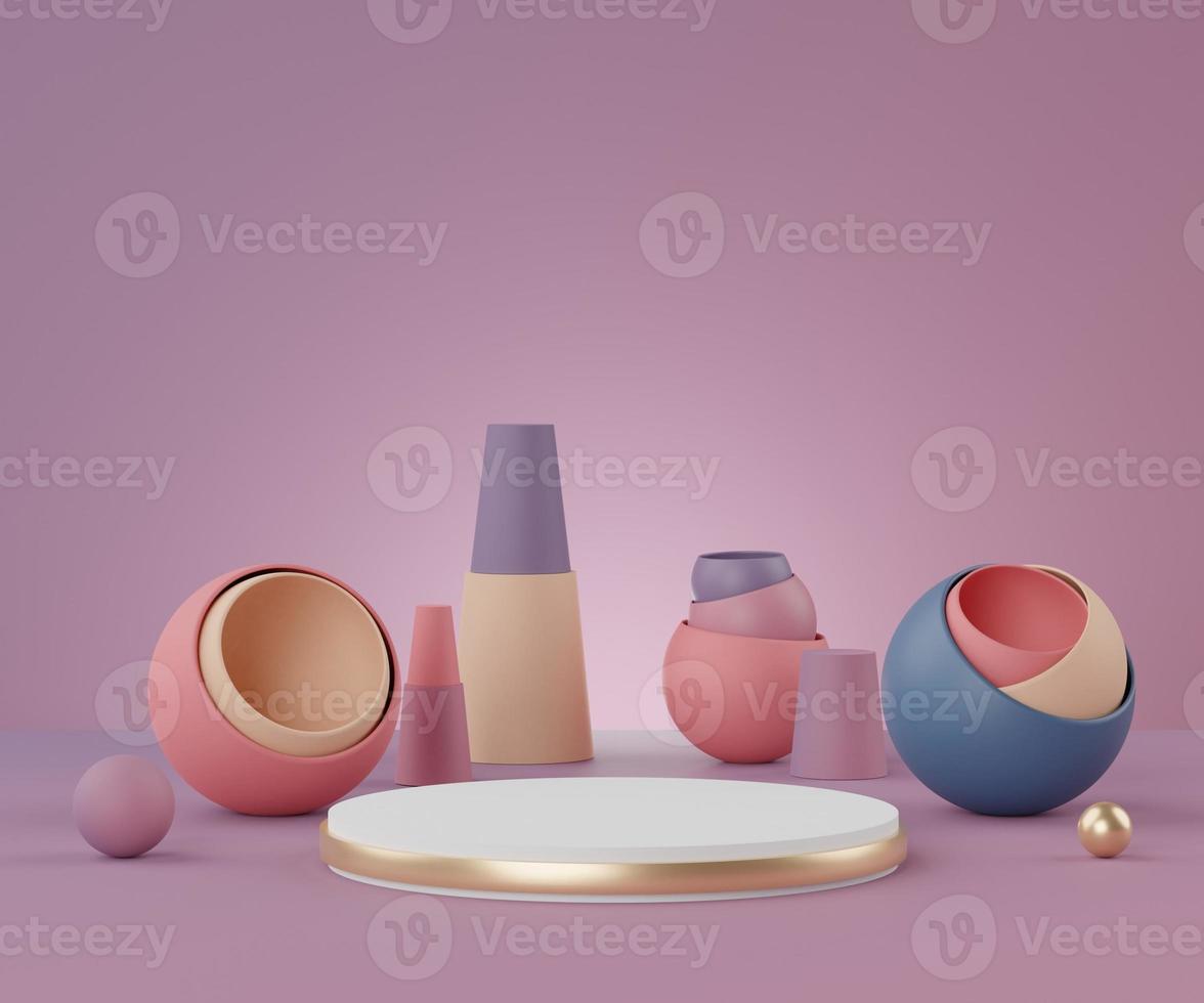 3d rendering of empty Podium in white marble and art shapes. Blank pedestal and shopfront with clean design. Minimal scene for product display. Pro Photo