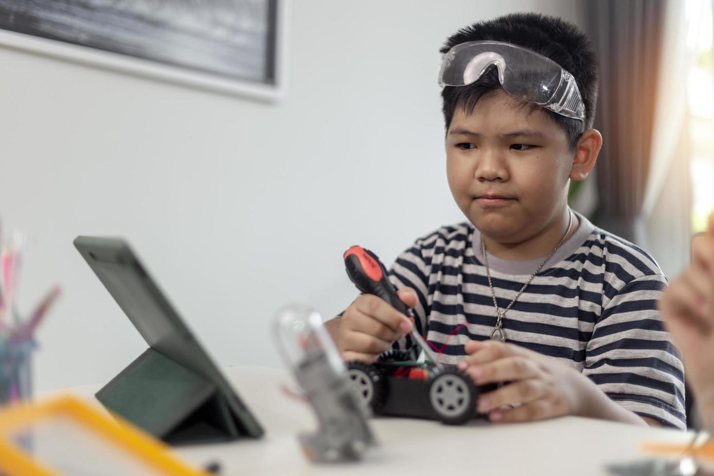 Young asia student remotely learn online at home in coding robot car and electronic board cable in STEM, STEAM, mathematics engineer science technology computer code in robotics for kids. Pro Photo