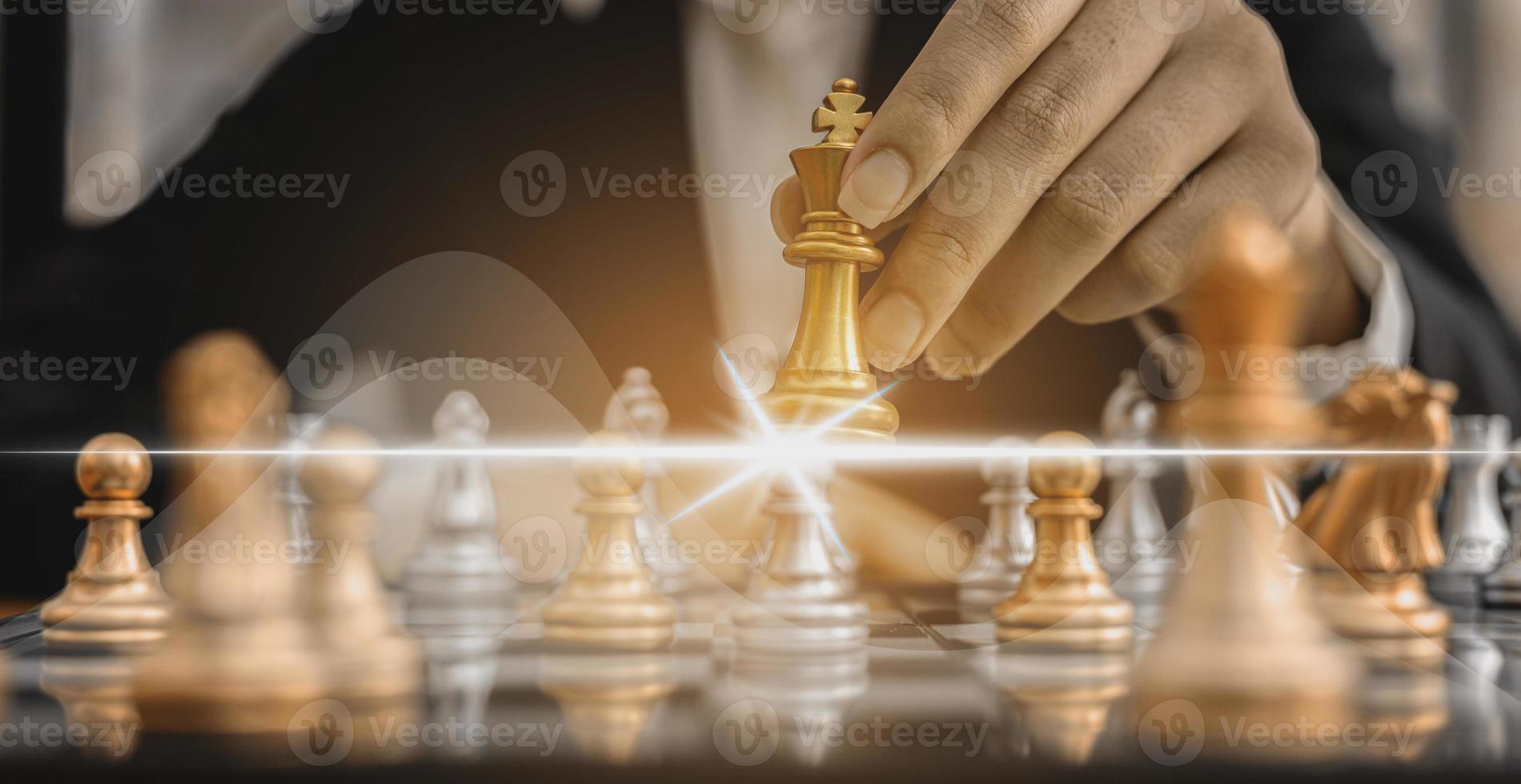 Person holding a chess piece against another opponent's chess, conceptual image of businessman playing chessboard compared to managing a business on risk, chart graphics showing financial flows. Pro Photo