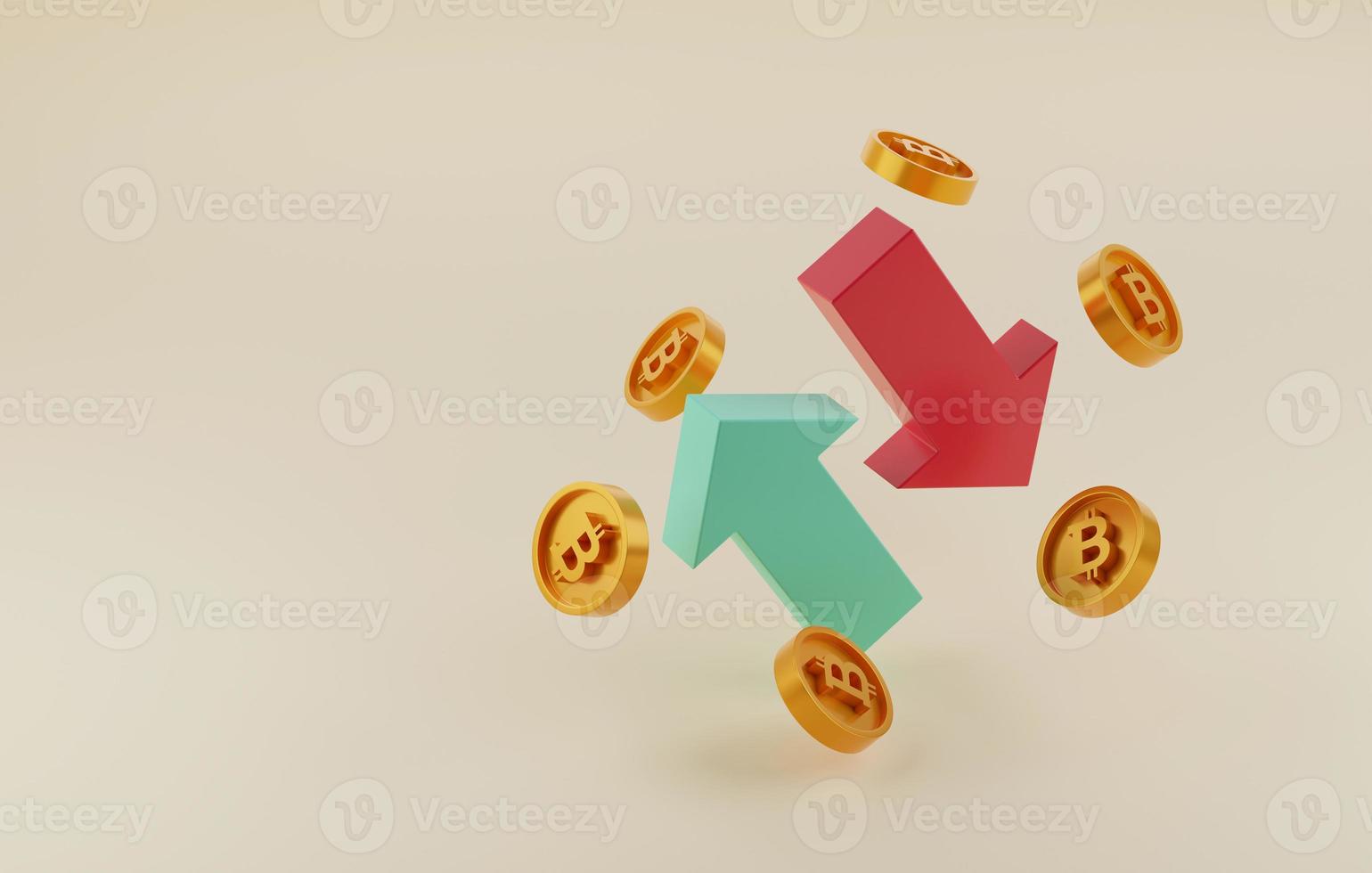 Graph green arrow pointing up and red arrow pointing down bitcoin coins floating around. Pro Photo