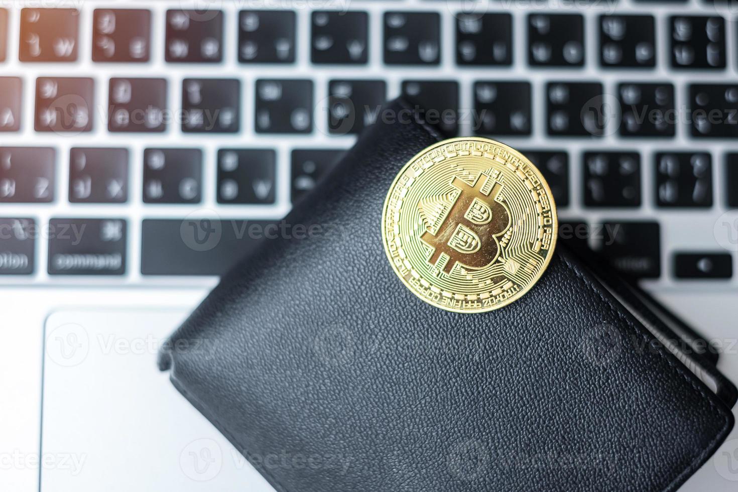 golden Cryptocurrency and wallet on keyboard laptop, Bitcoin coin. Crypto is Digital Money within the blockchain network Pro Photo